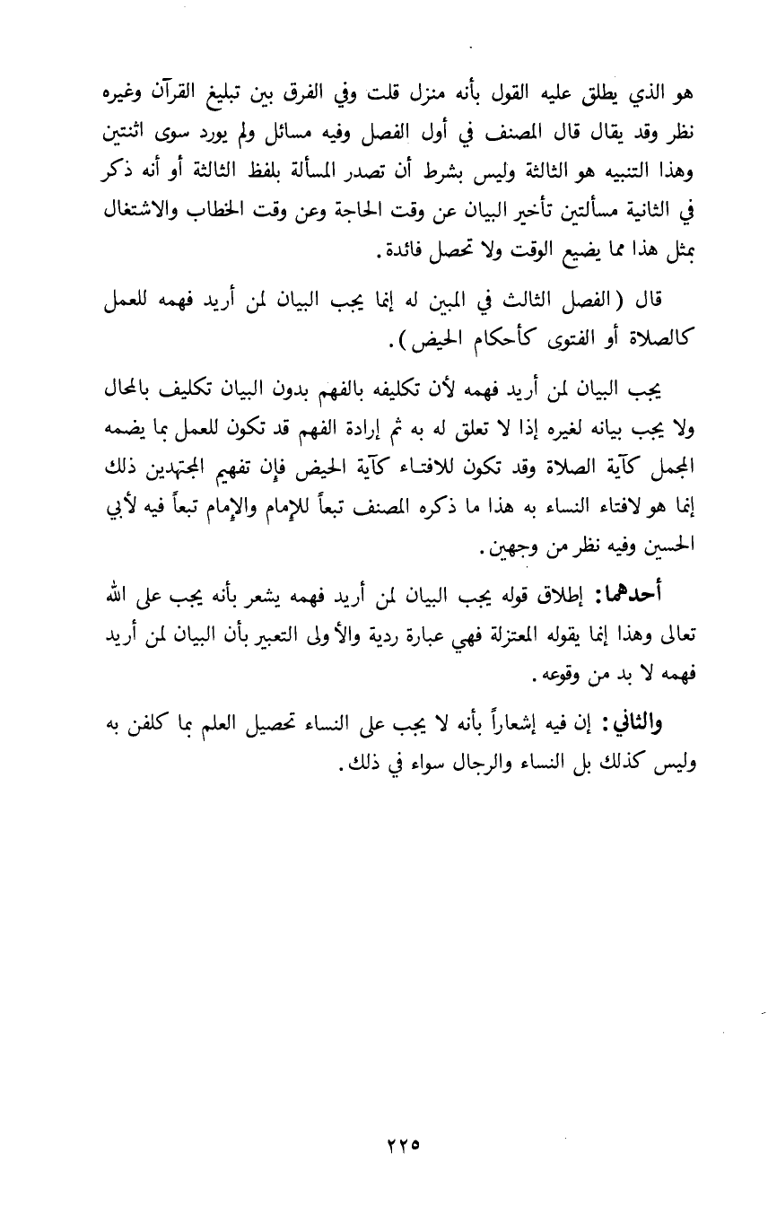 قال الفصل الثالث في المبين له إنما يجب البيان لمن أريد فهمه للعمل كالصلاة أو الفتوى كأحكام الحيض.