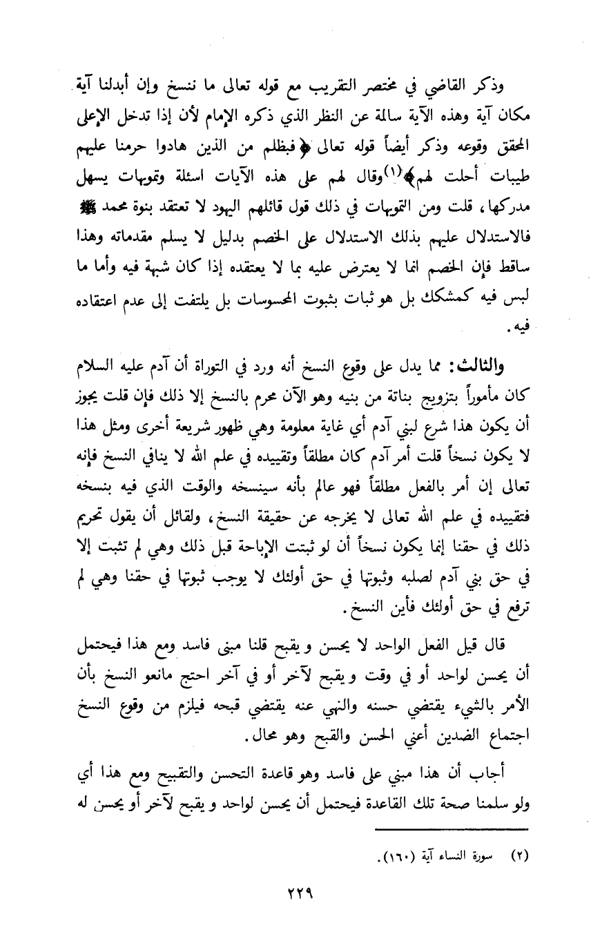 والثالث: مما يدل على وقوع النسخ انه ورد في التوراة ان آدم عليه السلام كان مأمورا بتزويج بناته من بنيه وهو الآن محرم بالنسخ الا ذلك فإن قلت يجوز ان يكون هذا شرع لبني آدم أي غاية معلومة وهي ظهور شريعة أخرى ومثل هذا لا يكون نسخا قلت أمر آدم كان مطلقا وتقييده في علم الله لا ينافي النسخ فانه تعالى ان أمر بالفعل مطلقا فهو عالم بأنه سينسخه والوقت الذي فيه بنسخه فتقييده في علم الله تعالى لا يخرجه عن حقيقة النسخ ولقائل ان يقول تحريم ذلك في حقنا إنما يكون نسخا ان لو ثبتت الإباحة قبل ذلك وهي لم تثبت الا في حق بني آدم لصلبه وثبوتها في حق أولئك لا يوجب ثبوتها في حقنا وهي لم ترفع في حق أولئك فأين النسخ.