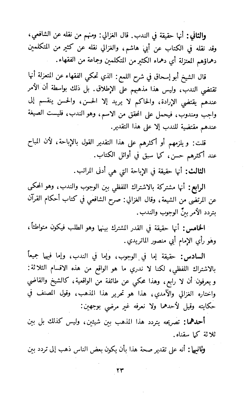 قال الشيخ أبو إسحاق في شرح اللمع الذي تحكي الفقهاء عن المعتزلة أنها تقتضي الندب وليس هذا مذهبهم على الاطلاق بل ذلك بواسطة أن الأمر عندهم يقتضي الإرادة والحاكم لا يريد الا الحسن والحسن ينقسم إلى واجب ومندوب فيحمل على المحقق من الاسم وهو الندب فليست الصيغة عندهم مقتضية للندب الا على هذا التقدير.