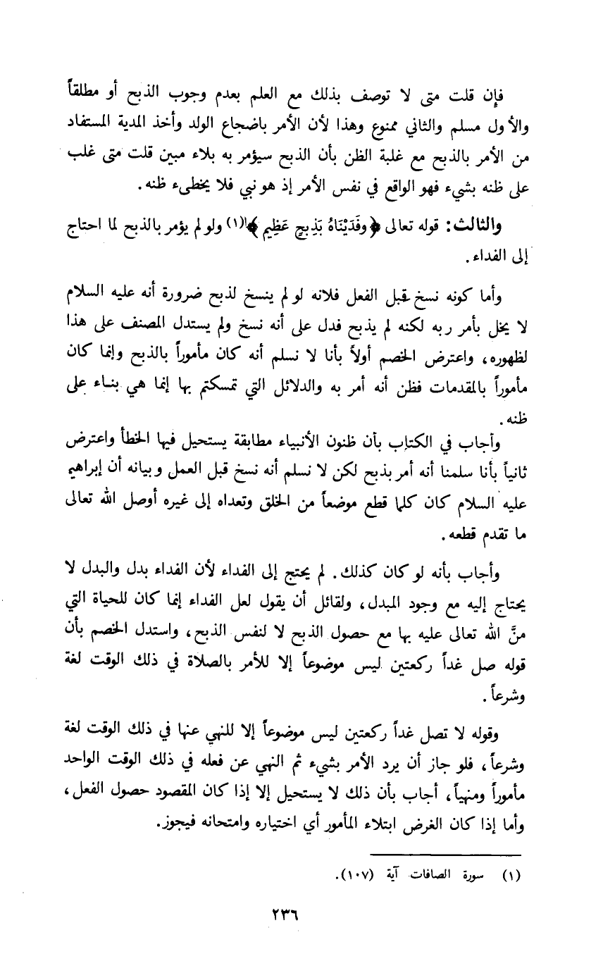 والثالث: قوله تعالى: {وفديناه بذبح عظيم} ١ ولولم يؤمر بالذبح لما احتاج الى الفداء.