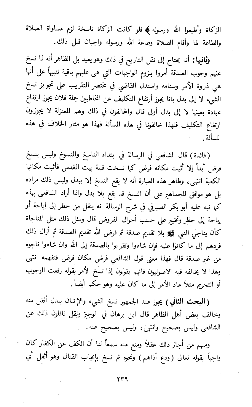 وثانيها: أنه يحتاج الى نقل التاريخ في ذلك وهو يعيد بل الظاهر انه لما نسخ عنهم وجوب الصدقة أمروا بلزوم الواجبات التي هي عليهم باقية تنبيها على أنها هي ذروة الامر وسنامه واستدل القاضي في مختصر التقريب على تجويز نسخ الشيء لا الى بدل بانا يجوز ارتفاع التكليف عن المخاطبين جملة فلأن يجوز ارتفاع عبادة بعينها لا الى بدل أولى قال والمخالفون في ذلك وهم المعتزلة لا يجوزون ارتفاع التكليف فلهذا خالفونا في هذه المسألة فهذا هو مثار الخلاف في هذه المسألة.