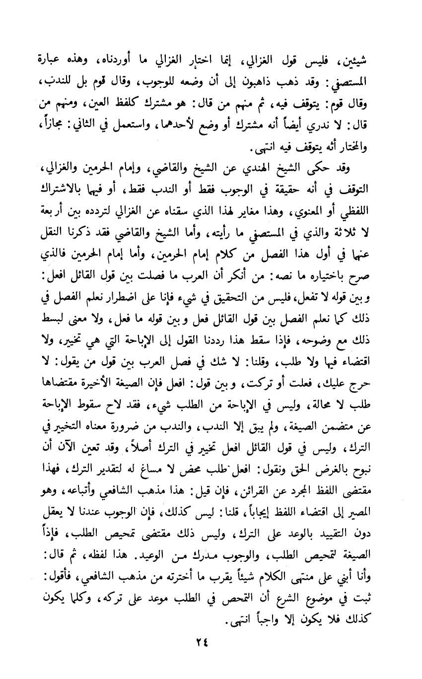 وقد حكى الشيخ الهندي عن الشيخ والقاضي وإمام الحرمين والغزالي التوقف في أنه حقيقة في الوجوب فقط أو الندب فقط أو فيهما بالاشتراك اللفظي أو المعنوي وهذا مغاير لهذا الذي سقناه عن الغزالي لتردده بين أربعة لا ثلاثة والذي في المستصفي ما رأيته وأما الشيخ والقاضي فقد ذكرنا النقل عنهما في أول هذا الفصل من كلام إمام الحرمين وأما إمام الحرمين فالذي صرح باختياره ما نصه من أنكر أن العرب ما فصلت بين قول القائل افعل وبين قوله لا تفعل فليس من التحقيق في شيء فإنا على اضطرار نعلم الفصل في ذلك كما نعلم الفصل بين قول القائل فعل وبين قوله ما فعل ولا معنى لبسط ذلك مع وضوحه فإذا سقط هذا رددنا القول إلى الإباحة التي هي تخيير ولا اقتضاء فيها ولا طلب وقلنا لا شك في فصل العرب بين قول من يقول لا حرج عليك فعلت أو تركت وبين قول افعل فان الصيغة الأخيرة مقتضاها طلب لا محالة وليس في الإباحة من الطلب شيء فقد لاح سقوط الإباحة عن متضمن الصيغة ولم يبق الا الندب والندب من ضرورة معناه التخيير في الترك وليس في قول القائل افعل تخيير في الترك أصلا وقد تعين الآن أن نبوح بالغرض الحق ونقول افعل طلب محض لا مساغ له لتقدير الترك فهذا مقتضى اللفظ المجرد عن القرائن فان قيل هذا مذهب الشافعي واتباعه وهو المصير إلى اقتضاء اللفظ إيجابا قلنا ليس كذلك فان الوجوب عندنا لا يعقل دون التقييد بالوعد على الترك وليس ذلك مقتضى تمحيص الطلب فإذا الصيغة لتمحيص الطلب والوجوب مدرك من الوعيد هذا لفظه ثم قال وأنا أبني على منتهى الكلام شيئا يقرب ما اخترته من مذهب الشافعي فأقول ثبت في موضوع الشرع أن التمحص في الطلب موعد على تركه وكلما يكون كذلك فلا يكون إلا واجبا انتهى.