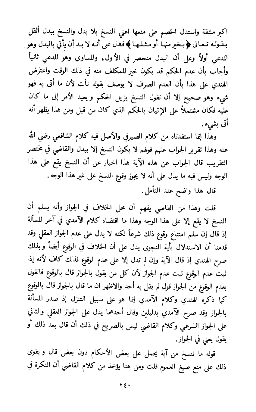 قلت: وهذا من القاضي يفهم ان محل الخلاف في الجواز وانه يسلم ان النسخ لا يقع إلا على هذا الوجه وهذا ما اقتضاه كلام الآمدي في آخر المسالة إذ قال ان سلم امتناع وقوع ذلك شرعا لكنه لا يدل على عدم الجواز العقلي وقد قدمنا ان الاستدلال بآية النجوى يدل على ان الخلاف في الوقوع ايضا وبذلك صرح الهندي إذ قال الآية وان لم تدل الا على عدم الوقوع فذلك كاف لأنه إذا ثبت عدم الوقوع ثبت عدم الجواز لأن كل من يقول بالجواز قال بالوقوع فالقول بعدم الوقوع من الجواز قول لم يقل به أحد والأظهر ان ما قال بالجواز قال بالوقوع كما ذكره الهندي وكلام الآمدي إنما هو على سبيل النزل إذ صدر المسالة بالجواز وقد صرح الآمدي بدليلين وقال احدهما يدل على الجواز العقلي والثاني على الجواز الشرعي وكلام القاضي ليس بالصريح في ذلك ان قال بعد ذلك أو يقول يعني في الجواز.