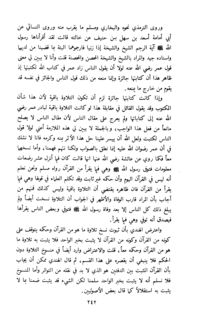 واعترض الهندي بأن ثبوت نسخ تلاوة ما هو من القرآن وحكمه يتوقف على كونه من القرآن وكونه من القرآن لا يثبت بخبر الواحد فلا يثبت به تلاوة ما هو من القرآن وحكمه معا قلت والاعتراض وارد ايضا في منسوخ التلاوة دون الحكم فلا ينبغي ان يقصره على هذا القسم ثم قال الهندي ممكن ان يجاب بان القرآن المثبت بين الدفتين هو الذي لا بد في نقله من التواتر وأما المنسوخ فلا نسلم أنه لا يثبت بخبر الواحد سلمنا لكن الشيء قد يثبت ضمنا بما لا يثبت به استقلالا كما قال بعض الأصوليين