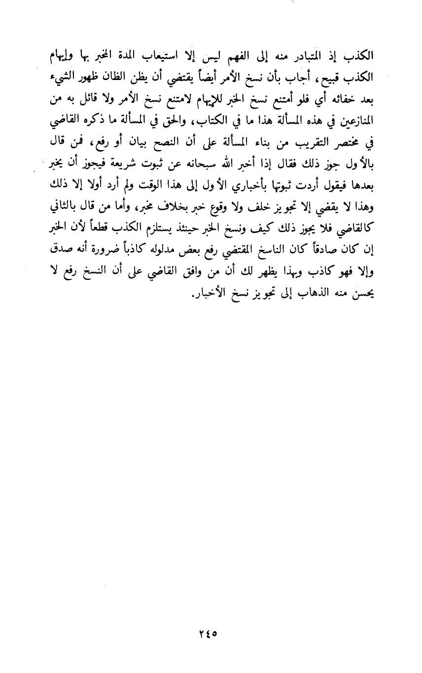 الكذب إذ المتبادر منه الى الفهم ليس الا استيعاب المدة المخبر بها وإيهام الكذب قبيح أجاب بأن نسخ الأمر ايضا يقتضي ان يظن الظان ظهور الشيء بعد خفائه أي فلو امتنع نسخ الخبر للإيهام لامتنع نسخ الأمر ولا قائل به من المنازعين في هذه المسألة هذا ما في الكتاب والحق في المسألة ما ذكره القاضي في مختصر التقريب من بناء المسألة على ان النصح بيان أو رفع فمن قال بالأول جوز ذلك فقال إذا اخبر الله سبحانه عن ثبوت شريعة فيجوز ان يخبر بعدها فيقول أردت ثبوتها بأخباري الأول الى هذا الوقت ولم أرد أولا الا ذلك وهذا لا يقضي الا تجويز خلف ولاوقوع خبر بخلاف مخبر وأما من قال بالثاني كالقاضي فلا يجوز ذلك كيف ونسخ الخبر حينئذ يستلزم الكذب قطعا لأن الخبر ان كان صادقا كان الناسخ المقتضي رفع بعض مدلوله كاذبا ضرورة أنه صدق وإلا فهو كاذب وبهذا يظهر لك ان من وافق القاضي على ان النسخ رفع لا يحسن منه الذهاب إلى تجويز نسخ الأخبار.