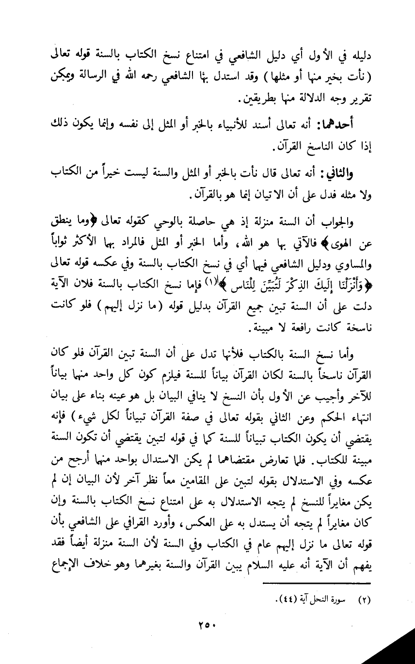 والجواب ان السنة منزلة إذ هي حاصلة بالوحي كقوله تعالى: {وَمَا يَنْطِقُ عَنِ الْهَوَى} فالآتي بها هو الله واما الخبر أو المثل فالمراد بهما الأكثر ثوابا والمساوي ودليل الشافعي فيهما اي في نسخ الكتاب بالسنة وفي عكسه قوله تعالى: {وَأَنْزَلْنَا إِلَيْكَ الذِّكْرَ لِتُبَيِّنَ لِلنَّاسِ} ١ فإما نسخ الكتاب بالسنة فلأن الآية دلت على ان السنة تبين جميع القرآن بدليل قوله: {مَا نُزِّلَ إِلَيْهِمْ} فلو كانت ناسخة كانت رافعة لا مبينة.