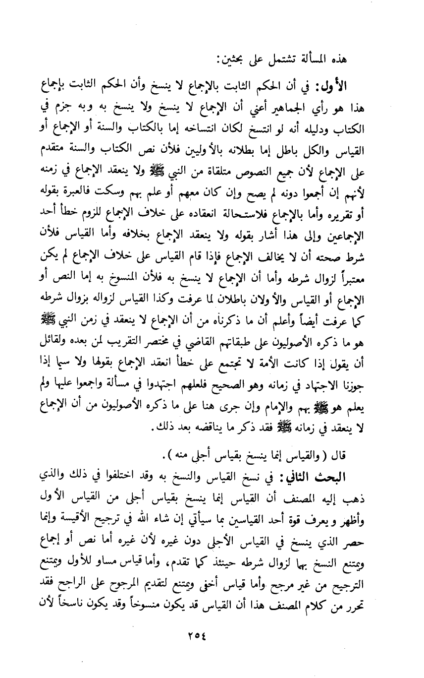 الأول: في ان الحكم الثابت بالاجماع لا ينسخ وان الحكم الثابت باجماع هذا هو رأي الجماهير اعني ان الاجماع لا ينسخ ولا ينسخ به وبه جزم في الكتاب ودليله انه لو انتسخ لكان انتساخه إما بالكتاب والسنة أو الاجماع أو القياس والكل باطل أما بطلانه بالأوليين فلأن نص الكتاب والسنة متقدم على الاجماع لأن جميع النصوص متلقاة من النبي صلى الله عليه وسلم ولا ينعقد الاجماع في زمنه لأنهم ان اجمعوا دونه لم يصح وان كان معهم أو علم بهم وسكت فالعبرة بقوله أو تقريره واما بالاجماع فلاستحالة انعقاده على خلاف الاجماع للزوم خطا أحد الاجماعين والى هذا أشار بقوله ولا ينعقد الاجماع بخلافه واما القياس فلأن شرط صحته ان لا يخالف الاجماع فإذا قام القياس على خلاف الاجماع لم يكن معتبرا لزوال شرطه واما ان الاجماع لا ينسخ به فلأن المنسوخ به إما النص أو الاجماع او القياس والأولان باطلان لما عرفت وكذا القياس لزواله بزوال شرطه كما عرفت أيضا وأعلم أن ما ذكرناه من أن الإجماع لا ينعقد في زمن النبي صلى الله عليه وسلم هو ما ذكره الأصوليون على طبقاتهم القاضي في مختصر التقريب لمن بعده ولقائل ان يقول إذا كانت الأمة لا تجتمع على خطا انعقد الإجماع بقولها ولا سيما إذا جوزنا الاجتهاد في زمانه وهو الصحيح فلعلهم اجتهدوا في مسألة واجمعوا عليها ولم يعلم هو صلى الله عليه وسلم بهم والامام وان جرى هنا على ما ذكره الأصوليون من ان الاجماع لا ينعقد في زمانه صلى الله عليه وسلم فقد ذكر ما يناقضه بعد ذلك.