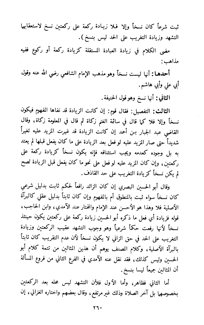 وقال أبو الحسين البصري ان كان الزائد رافعا لحكم ثابت ٢بدليل شرعي كان نسخا سواء ثبت بالمنطوق أم بالمفهوم وان كان ثابتا بدليل عقلي كالبرآة الأصلية فلا وهذا هو الأحسن عند الإمام والمختار عند الآمدي وابن الحاجب قوله فزيادة أي فعل ما ذكره أبو الحسين زيادة ركعة على ركعتين يكون حينئذ نسخا لأنها رفعت حكما شرعيا وهو وجوب التشهد عقيب الركعتين وزيادة التغريب على الحد في حق الزاني لا يكون نسخا لأن عدم التقريب كان ثابتا بالبرآة الأصلية وكلام المصنف يوهم ان هذين المثالين من تتمة كلام أبو الحسين وليس كذلك فقد نقل عنه الآمدي في الفرع الثاني من فروع المسالة أن المثالين جميعا ليسا بنسخ.