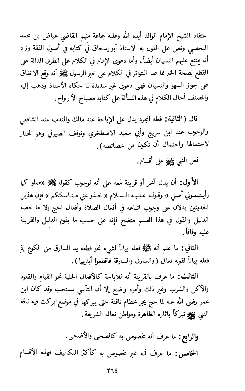 الثالث: ما عرف بالقرينة انه للإباحة كالأفعال الجلية نحو القيام والقعود والأكل والشرب وغير ذلك وأمره واضح الا أن التأسي مستحب وقد كان ابن عمر رضي الله عنه لما حج يجر خطام ناقته حتى يبركها في موضع بركت فيه ناقة النبي صلى الله عليه وسلم تبركا بآثاره الظاهرة ومواطن نعاله الشريفة.