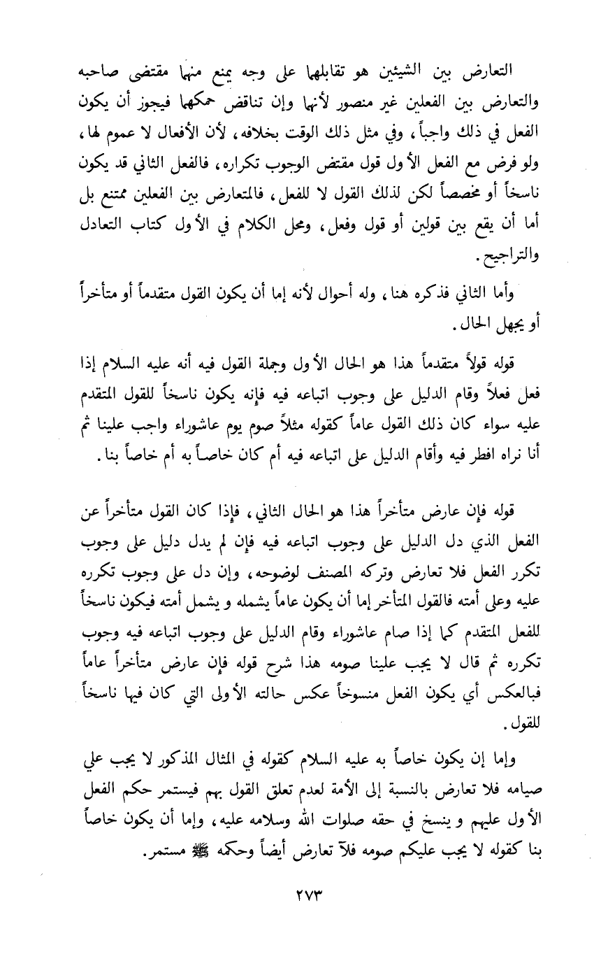 وإما أن يكون خاصا به عليه السلام كقوله في المثال المذكور: "لا يجب علي صيامه" فلا تعارض بالنسبة إلى الأمة لعدم تعلق القول بهم فيستمر حكم الفعل الأول عليهم وينسخ في حقه صلوات الله وسلامه عليه وإما أن يكون خاصا بنا كقوله: "لا يجب عليكم صومه" فلا تعارض أيضا وحكمه صلى الله عليه وسلم مستمر.