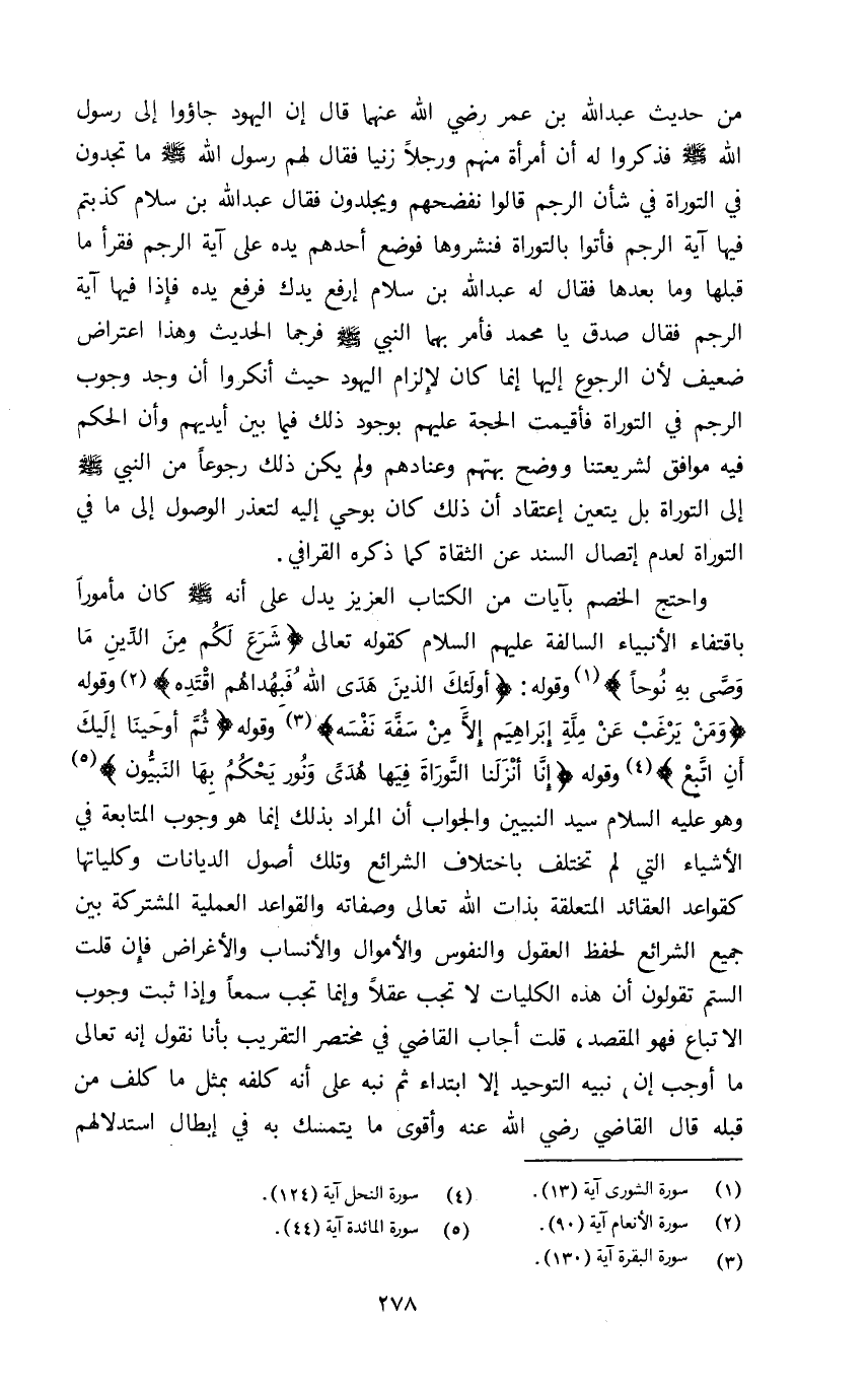 واحتج الخصم بآيات من الكتاب العزيز يدل على انه صلى الله عليه وسلم كان مأمورا باقتفاء الأنبياء السالفة عليهم السلام كقوله تعالى: {شَرَعَ لَكُمْ مِنَ الدِّينِ مَا وَصَّى بِهِ نُوحاً} ١ وقوله: {أُولَئِكَ الَّذِينَ هَدَى اللَّهُ فَبِهُدَاهُمُ اقْتَدِهْ} ٢ وقوله: {وَمَنْ يَرْغَبُ عَنْ مِلَّةِ إِبْرَاهِيمَ إِلَّا مَنْ سَفِهَ نَفْسَهُ} ٣ وقوله: {ثُمَّ أَوْحَيْنَا إِلَيْكَ أَنِ اتَّبِعْ} ٤ وقوله: {إِنَّا أَنْزَلْنَا التَّوْرَاةَ فِيهَا هُدىً وَنُورٌ يَحْكُمُ بِهَا النَّبِيُّونَ} ٥ وهو عليه السلام سيد النبيين والجواب ان المراد بذلك إنما هو وجوب المتابعة في الأشياء التي لم تختلف باختلاف الشرائع وتلك أصول الديانات وكلياتها كقواعد العقائد المتعلقة بذات الله تعالى وصفاته والقواعد العملية المشتركة بين جميع الشرائع لحفظ العقول والنفوس والأموال والأنساب والأغراض فان قلت ألستم تقولون ان هذه الكليات لا تجب عقلا وانما تجب سمعا وإذا ثبت وجوب الاتباع فهو المقصد قلت أجاب القاضي في مختصر التقريب بانا نقول انه تعالى ما أوجب إن نبيه التوحيد الا ابتداء ثم نبه على انه كلفه بمثل ما كلف من قبله قال القاضي رضي الله عنه وأقوى ما يتمسك به في إبطال استدلالهم