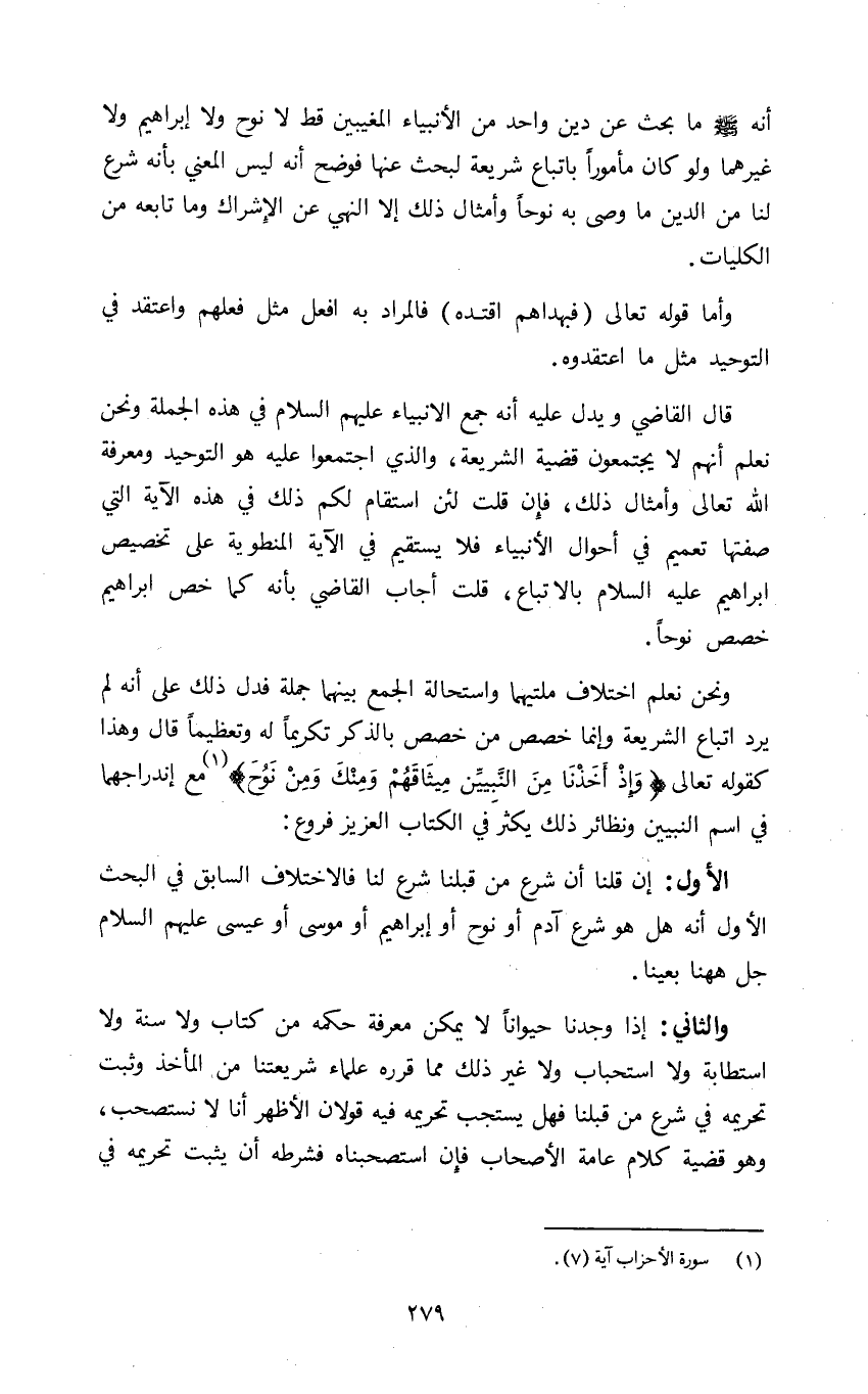 أنه صلى الله عليه وسلم ما بحث عن دين واحد من الأنبياء المغيبين قط لا نوح ولا ابراهيم ولا غيرهما ولو كان مأمورا باتباع شريعة لبحث عنها فوضح انه ليس المعنى بأنه شرع لنا من الدين ما وصى به نوحا وأمثال ذلك الا النهي عن الإشراك وما تابعه من الكليات.