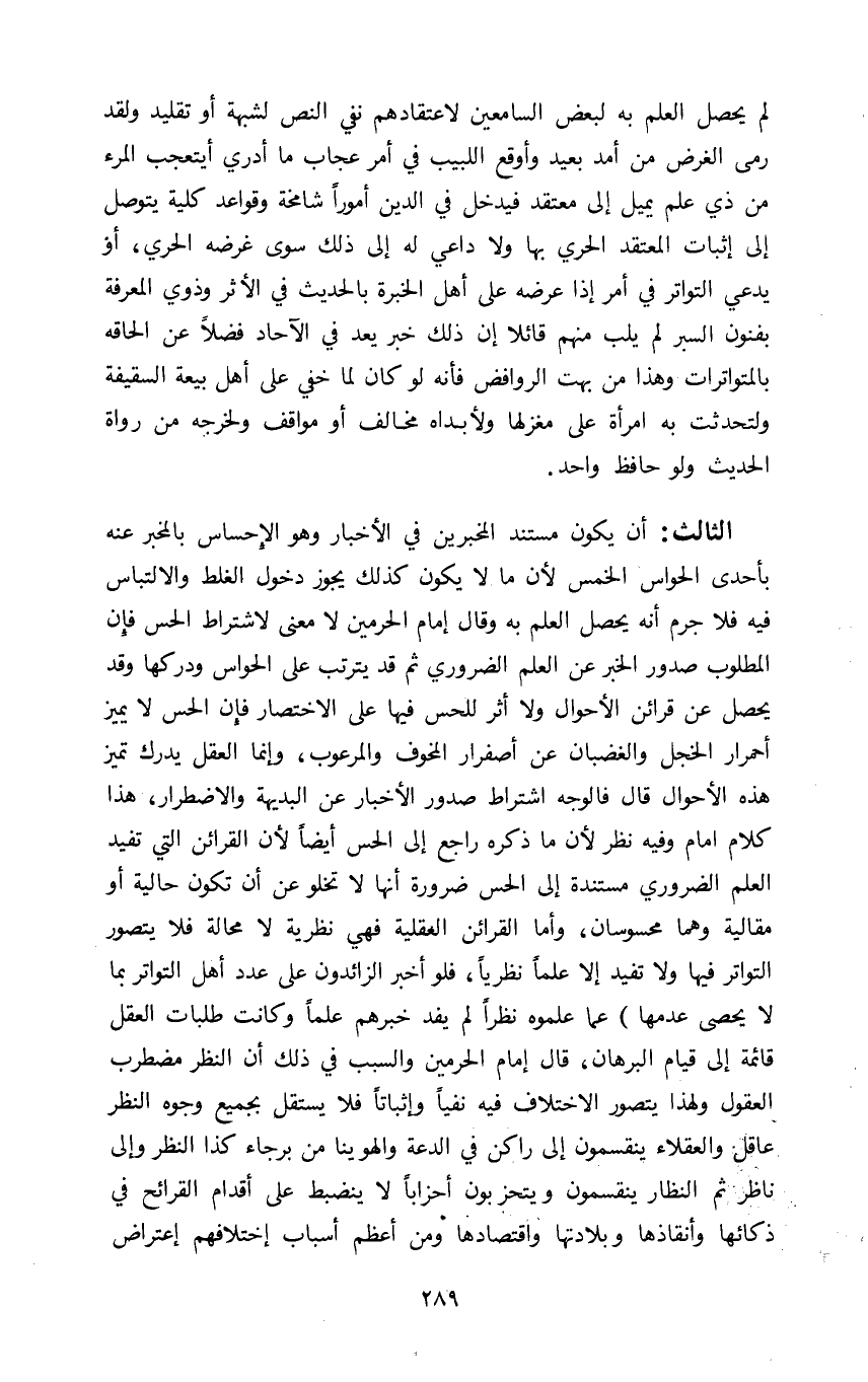 الثالث: ان يكون مستند المخبرين في الاخبار وهو الإحساس بالمخبر عنه الحواس الخمس لأن ما لا يكون كذلك يجوز دخول الغلط والالتباس فيه فلا جرمه انه يحصل العلم به وقال امام الحرمين لا معنى لاشتراط الحس فإن المطلوب صدور الخبر عن العلم الضروري ثم قد يترتب على الحواس ودركها وقد يحصل عن قرائن الأحوال ولا اثر للحس فيها على الاختصار فان الحس لا يميز احمرار الخجل والغضبان عن اصفرار المخوف والمرعوب وانما العقل يدرك تميز هذه الأحوال قال فالوجه اشتراط صدور الاخبار عن البديهة والاضطرار هذا كلام امام وفيه نظر لأن ما ذكره راجع الى الحس ايضا لأن القرائن التي تفيد العلم الضروري مستندة الى الحس ضرورة أنها لا تخلو عن ان تكون حالية أو مقالية وهما محسوسان وأما القرائن العقلية فهي نظرية لا محالة فلا يتصور التواتر فيها ولا تفيد الا علما نظريا فلو اخبر الزائدون على عدد أهل التواتر بما لا يحصى عدمها عما علموه نظرا لم يفد خبرهم علما وكانت طلبات العقل قائمة الى قيام البرهان قال امام الحرمين والسبب في ذلك ان النظر مضطرب العقول ولهذا يتصور الاختلاف فيه نفيا وإثباتا فلا يستقل بجميع وجوه النظر عاقل والعقلاء ينقسمون الى راكن في الدعة والهوينا من برجاء كذا النظر والى ناظر ثم النظار ينقسمون ويتحزبون أحزابا لا ينضبط على أقدام القرائح في ذكائها وأنقاذها وبلادتها واقتصادها ومن اعظم أسباب اختلافهم اعتراض