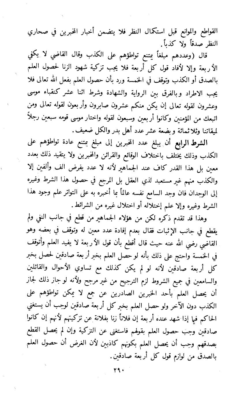 الشرط الرابع: ان يبلغ عدد المخبرين الى مبلغ يمتنع عادة تواطؤهم على الكذب وذلك يختلف باختلاف الوقائع والقرائن والمخبرين ولا يتقيد ذلك بعدد معين بل هذا القدر كاف عند الجماهير لأنه لا عدد يفرض ألف وألفين الا والكذب منهم غير مستعبد لذي العقل بل المرجع في حصول هذا الشرط وغيره إلى الوجدان فإن وجد السامع نفسه عالما بما اخبره به على التواتر علم وجود هذا الشرط وغيره وإلا علم اختلال غيره من الشرائط.