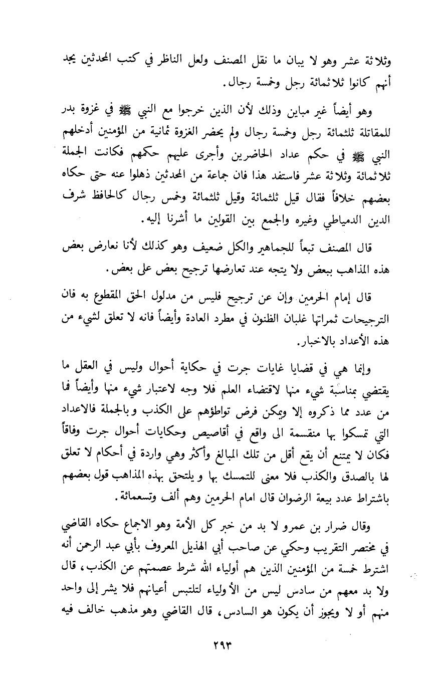 وانما هي في قضايا غايات جرت في حكاية أحوال وليس في العقل ما يقتضي بمناسبة شيء منها لاقتضاء العلم فلا وجه لاعتبار شيء منها وأيضا فما من عدد مما ذكروه الا ويمكن فرض تواطؤهم على الكذب وبالجملة فالأعداد التي تمسكوا بها منقسمة الى واقع في أقاصيص وحكايات أحوال جرت وفاقا فكان لا يمتنع ان يقع اقل من تلك المبالغ واكثر وهي واردة في أحكام لا تعلق لها بالصدق والكذب فلا معنى للتمسك بها ويلتحق بهذه المذاهب قول بعضهم باشتراط عدد بيعة الرضوان قال إمام الحرمين وهم ألف وتسعمائة.