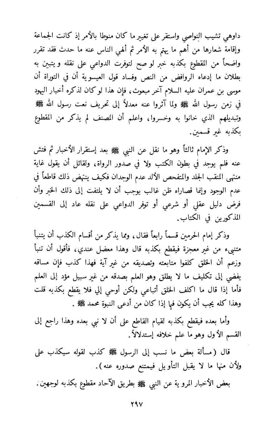 دواهي تشيب النواصي واستقر على تغيير ما كان منوطا بالأمر اذ كانت الجماعة واقامة شعارها من أهم ما يهتم به الأمر ثم الهي الناس عنه ما حدث فقد تقرر واضحا من المقطوع بكذبه خبر لو صح لتوفرت الدواعي على نقله ويتبين به بطلان ما ادعاه الروافض من النص وفساد قول العيسوية ان في التوراة ان موسى بن عمران عليه السلام آخر مبعوث فان هذا لو كان لذكره أخبار اليهود في زمن رسول الله صلى الله عليه وسلم ولما آثروا عنه معدلا إلى تحريف نعت رسول الله صلى الله عليه وسلم وتبديلهم الذي خانوا به وخسروا واعلم ان المصنف لم يذكر من المقطوع بكذبه غير قسمين.