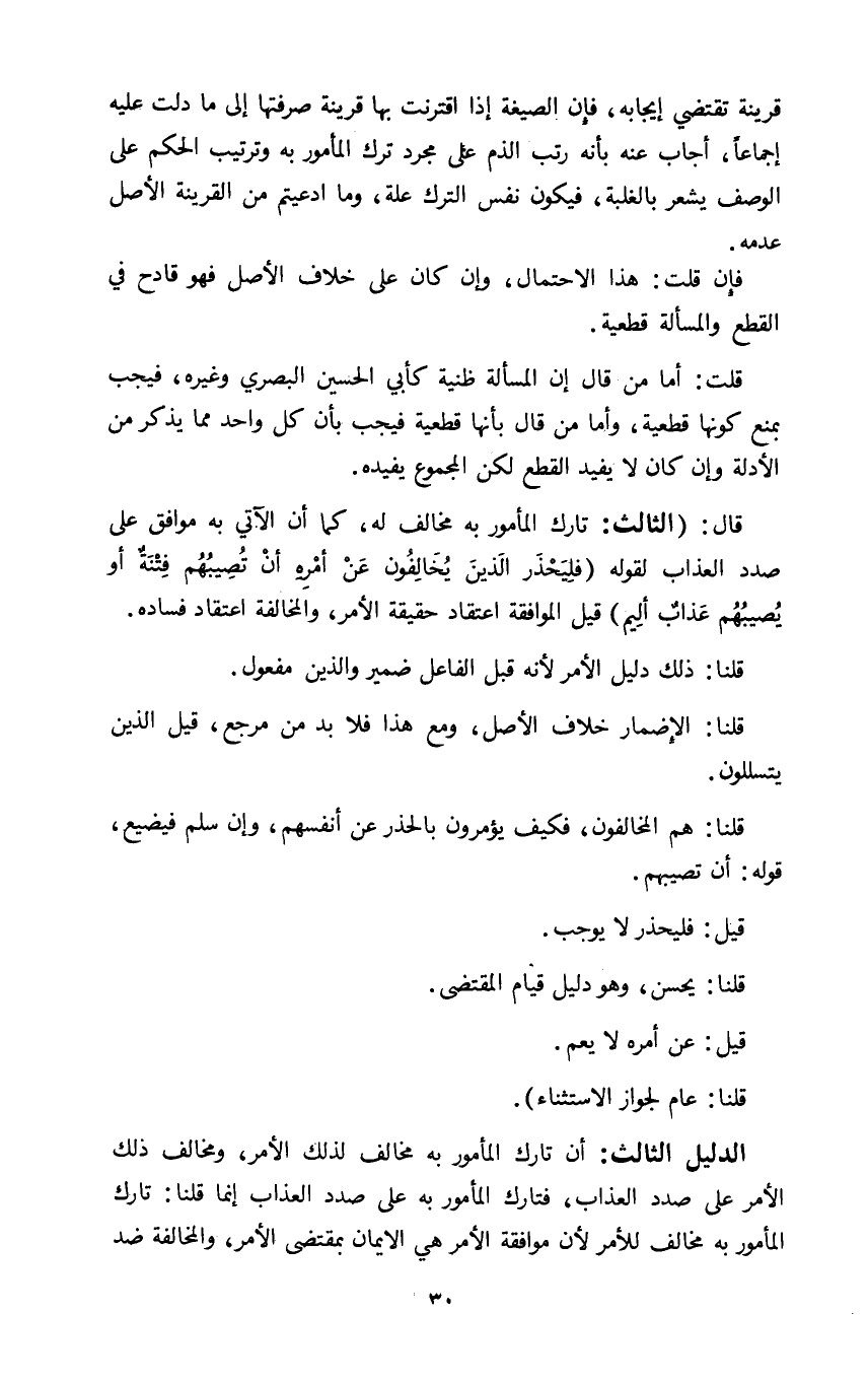الدليل الثالث: أن تارك المأمور به مخالف لذلك الأمر ومخالف ذلك الأمر على صدد العذاب فبارك المأمور به على صدد العذاب إنما قلنا تارك المأمور به مخالف للأمر لأن موافقة الأمر هي الإيمان بمقتضى الأمر والمخالفة ضد