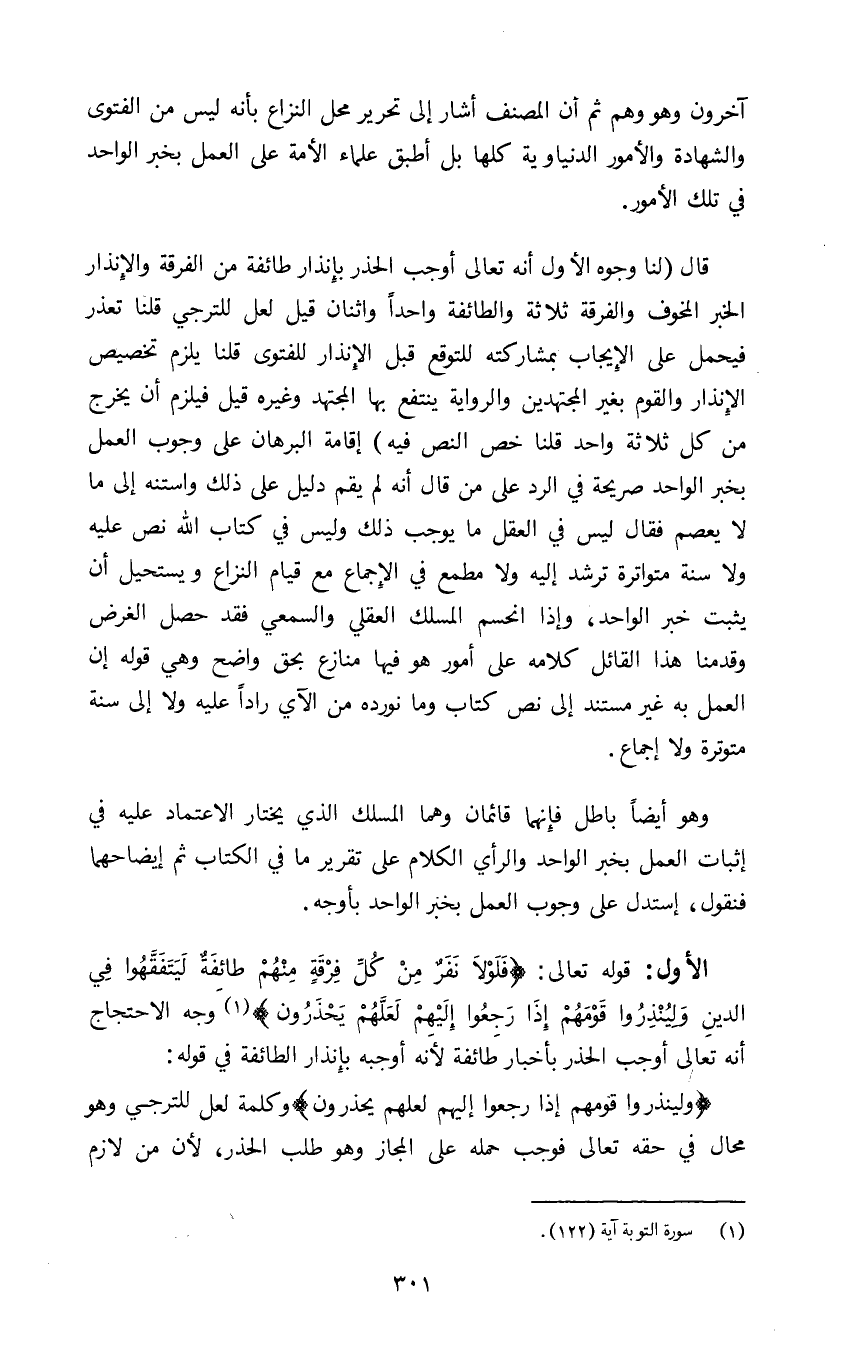 قال لنا وجوه الاول انه تعالى اوجب الحذر بانذار طائفة من الفرقة والانذار الخبر المخوف والفرقة ثلاثة والطائفة واحدا واثنان قيل لعل للترجي قلنا تعذر فيحمل على الايجاب بمشاركته للتوقع قبل الانذار للفتوى قلنا يلزم تخصيص الانذار والقوم بغير المجتهدين والرواية ينتفع بها المجتهد وغيره قيل فيلزم ان يخرج من كل ثلاثة واحد قلنا خص النص فيه اقامة البرهان على وجوب العمل بخبر الواحد صريحة في الرد على من قاله انه لم يقم دليل على ذلك واستنه الى ما لا يعصم فقال ليس في العقل ما يوجب ذلك وليس في كتاب الله نص عليه ولا سنة متواترة ترشد اليه ولا مطمع في الاجماع مع قيام النزاع ويستحيل ان يثبت خبر الواحد واذا انحسم المسلك العقلي والسمعي فقد حصل الغرض وقدمنا هذا القائل كلامه على امور هو فيها منازع بحق واضح وهي قوله ان العمل به غير مستند الى نص كتاب ومانورده من الآي رادا عليه ولا إلى سنة متوترة ولا إجماع.