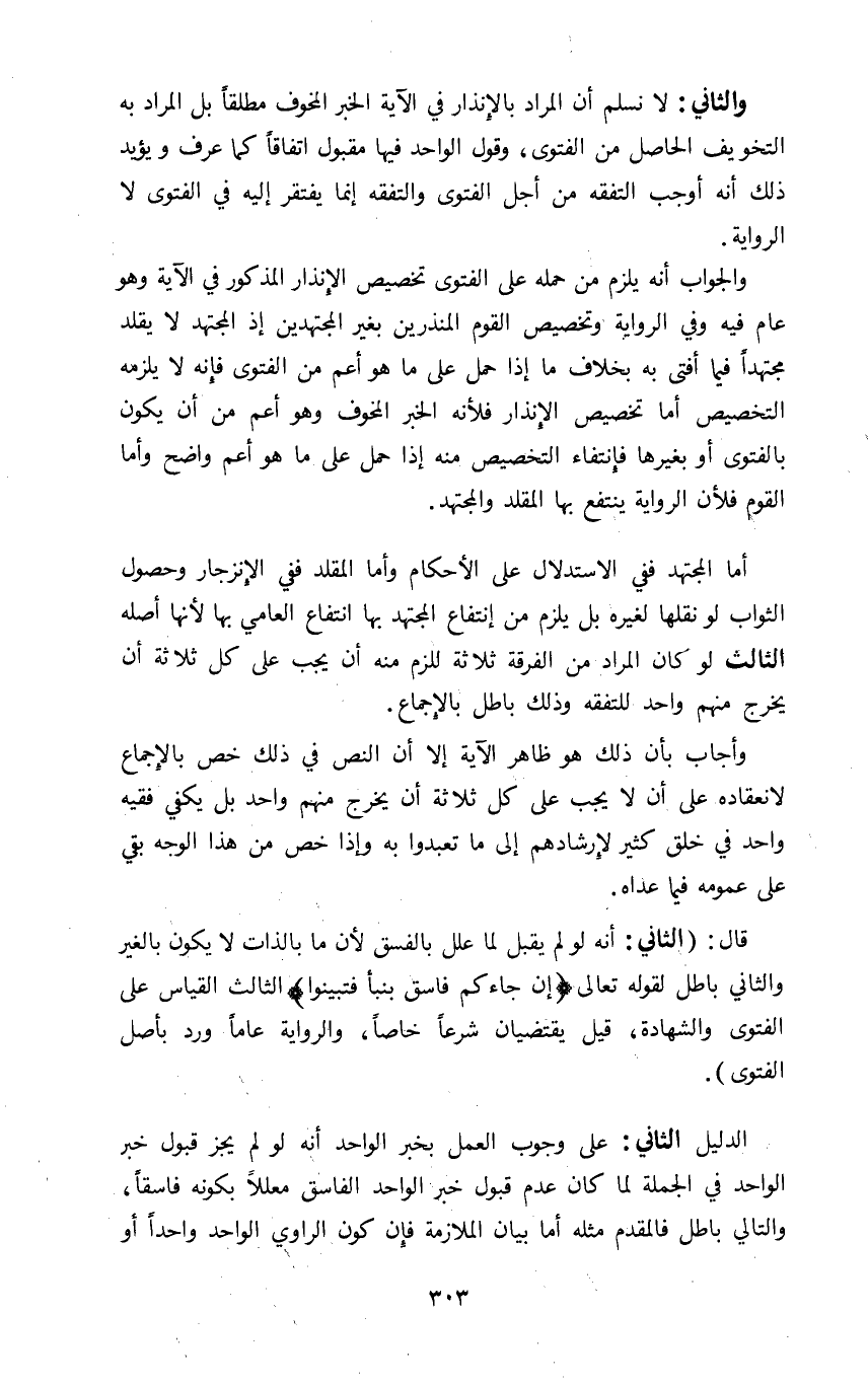 والثاني: لا نسلم أن المراد بالانذار في الآية الخبر المخوف مطلقا بل المراد به التخويف الحاصل من الفتوى وقول الواحد فيها مقبول اتفاقا كما عرف ويؤيد ذلك انه اوجب التفقه من اجل الفتوى والتفقه انما يفتقر اليه في الفتوى لا الرواية.