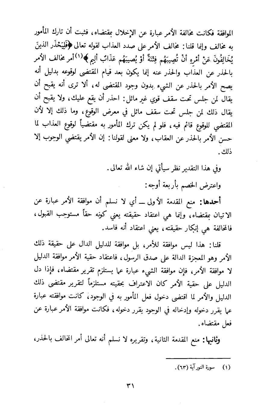 الموافقة فكانت مخالفة الأمر عبارة عن الإخلال بمقتضاه فثبت أن تارك المأمور به مخالف وإنما قلنا مخالف الأمر على صدد العذاب لقوله تعالى: {فَلْيَحْذَرِ الَّذِينَ يُخَالِفُونَ عَنْ أَمْرِهِ أَنْ تُصِيبَهُمْ فِتْنَةٌ أَوْ يُصِيبَهُمْ عَذَابٌ أَلِيمٌ} ١ أمر مخالف الأمر بالحذر عن العذاب والحذر عنه إنما يكون بعد قيام المقتضى لوقوعه بدليل أنه يصح الأمر بالحذر عن الشيء بدون وجود المقتضى له ألا ترى أنه يقبح أن يقال لمن جلس تحت سقف قوي غير مائل إحذر أن يقع عليك ولا يقبح أن يقال ذلك لمن جلس تحت سقف مائل في معرض الوقوع وما ذلك إلا لأن المقتضي للوقوع قائم فيه فلولم يكن ترك المأمور به مقتضيا لوقوع العذاب لما حسن الأمر بالحذر عن العقاب ولا معنى لقولنا: إن الأمر يقتضي الوجوب إلا ذلك.