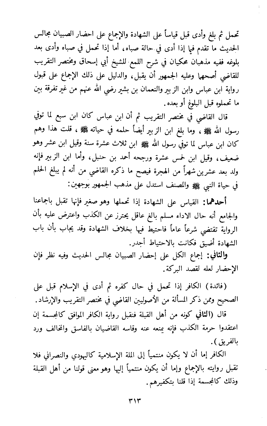تحمل ثم بلغ وأدى قبل قياسا على الشهادة والإجماع على إحضار الصبيان مجالس الحديث ما تقدم فيما إذا أدى في حالة صباه أما إذا تحمل في صباه وأدى بعد بلوغه ففيه مذهبان محكيان في شرح اللمع للشيخ أبى إسحاق ومختصر التقريب للقاضي أصحهما وعليه الجمهور أن يقبل والدليل على ذلك الإجماع على قبول رواية ابن عباس وابن الزبير والنعمان بن بشير رضي الله عنهم من غير تفرقة بين ما تحملوه قبل البلوغ أو بعده.