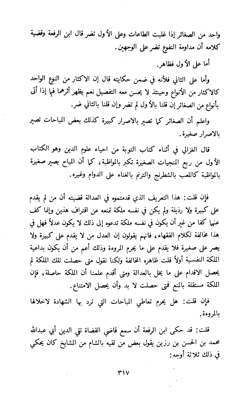 قال الغزالي في أثناء كتاب التوبة من إحياء علوم الدين وهو الكتاب الأول من ربع المنجيات الصغيرة تكبر بالمواظبة كما أن المباح يصير صغيرة بالمواظبة كاللعب بالشطرنج والترنم بالغناء على الدوام وغيره.