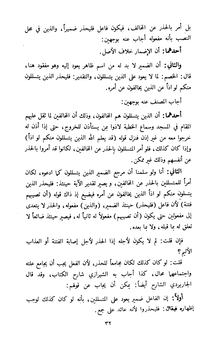 والثاني: أن الضمير لا بد له من اسم ظاهر يعود إليه وهو مفقود هنا قال الخصم لما لا يعود على الذين يتسللون والتقدير فليحذر الذين يتسللون منكم لواذا عن الذين يخالفون عن أمره.