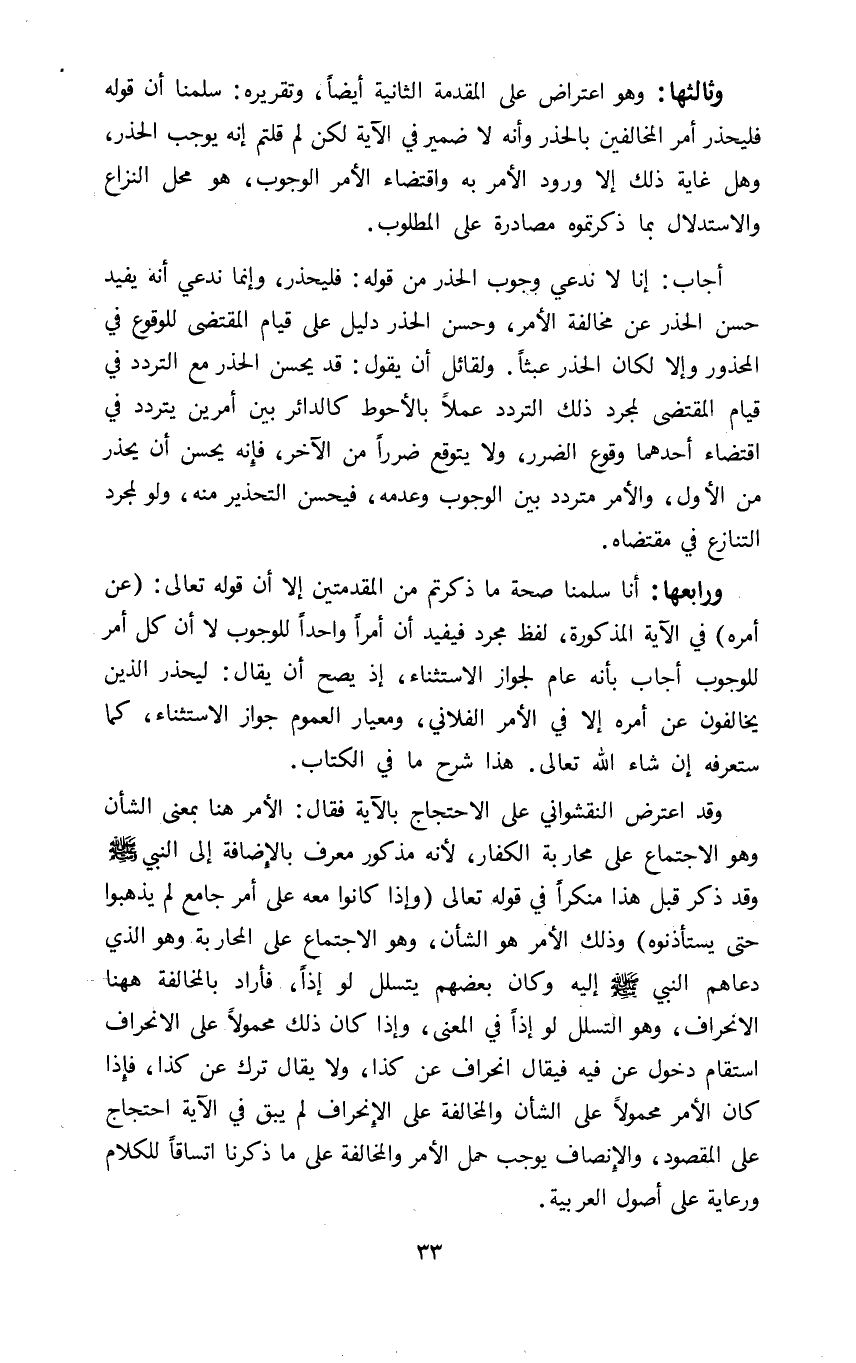 وثالثها: وهو اعتراض على المقدمة الثانية أيضا وتقريره سلمنا أن قوله فليحذر أمر المخالفين بالحذر وأنه لا ضمير في الآية لكن لم قلتم انه يوجب الحذر وهل غاية ذلك الا ورود الأمر به واقتضاء الأمر الوجوب هو محل النزاع والاستدلال بما ذكرتموه مصادرة على المطلوب.