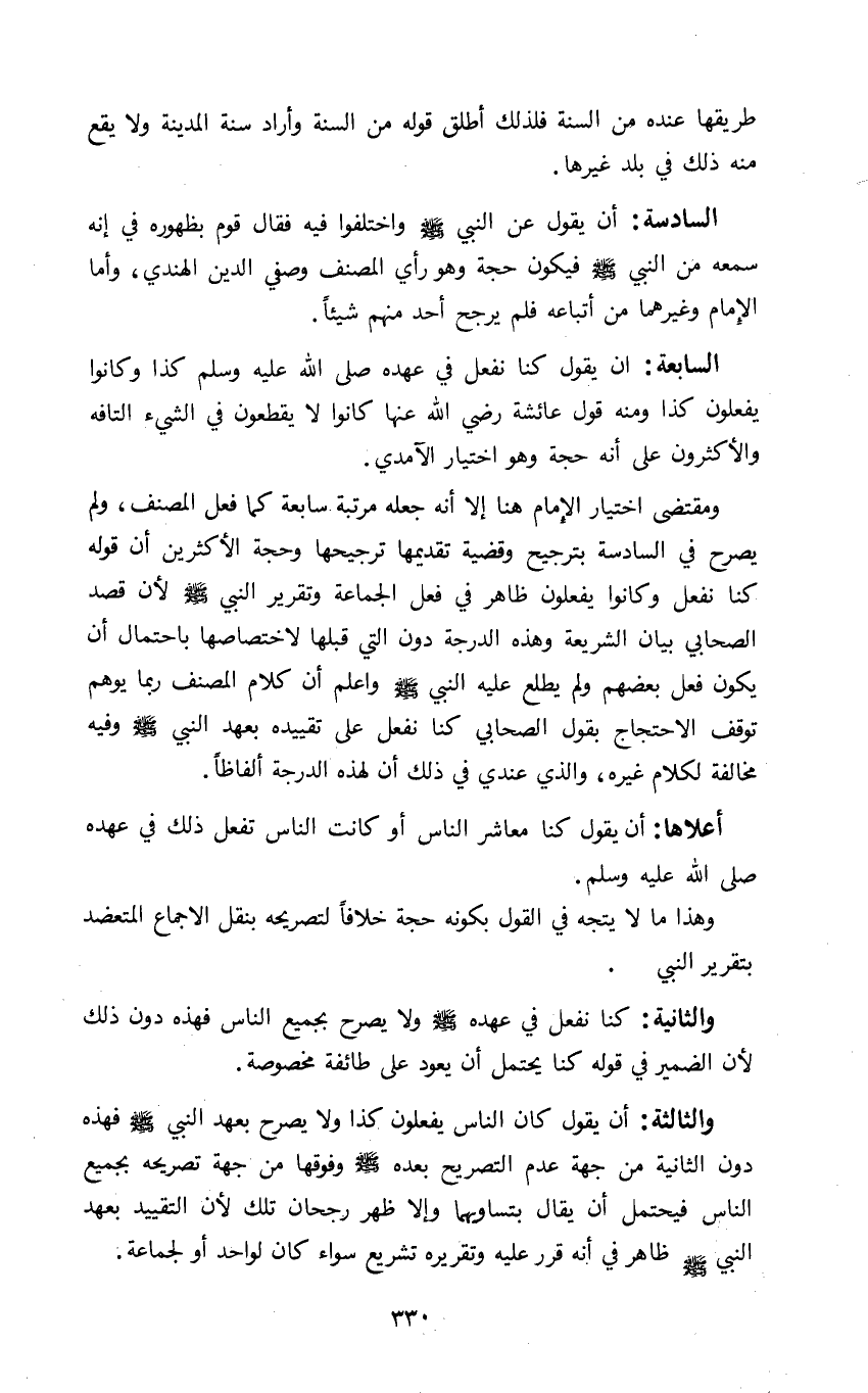 السابعة: أن يقول كنا نفعل في عهده صلى الله عليه وسلم كذا وكانوا يفعلون كذا ومنه قول عائشة رضي الله عنها كانوا لا يقطعون في الشيء التافه والأكثرون على أنه حجة وهو اختيار الآمدي.