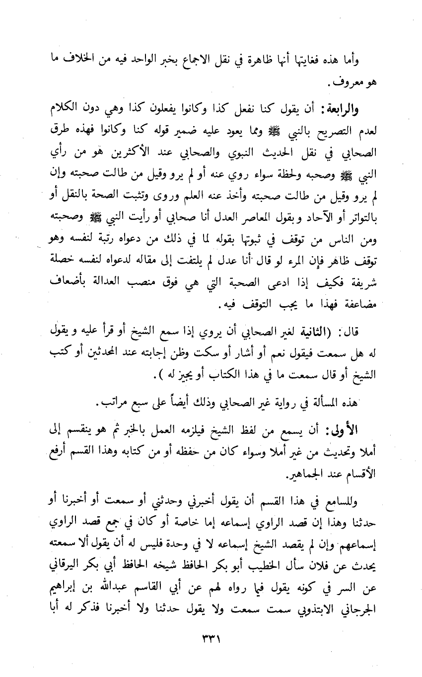 قال: الثانية لغير الصحابي أن يروي إذا سمع الشيخ أو قرأ عليه ويقول له هل سمعت فيقول نعم أو أشار أو سكت وظن إجابته عند المحدثين أو كتب الشيخ أو قال سمعت ما في هذا الكتاب أو يجيز له.