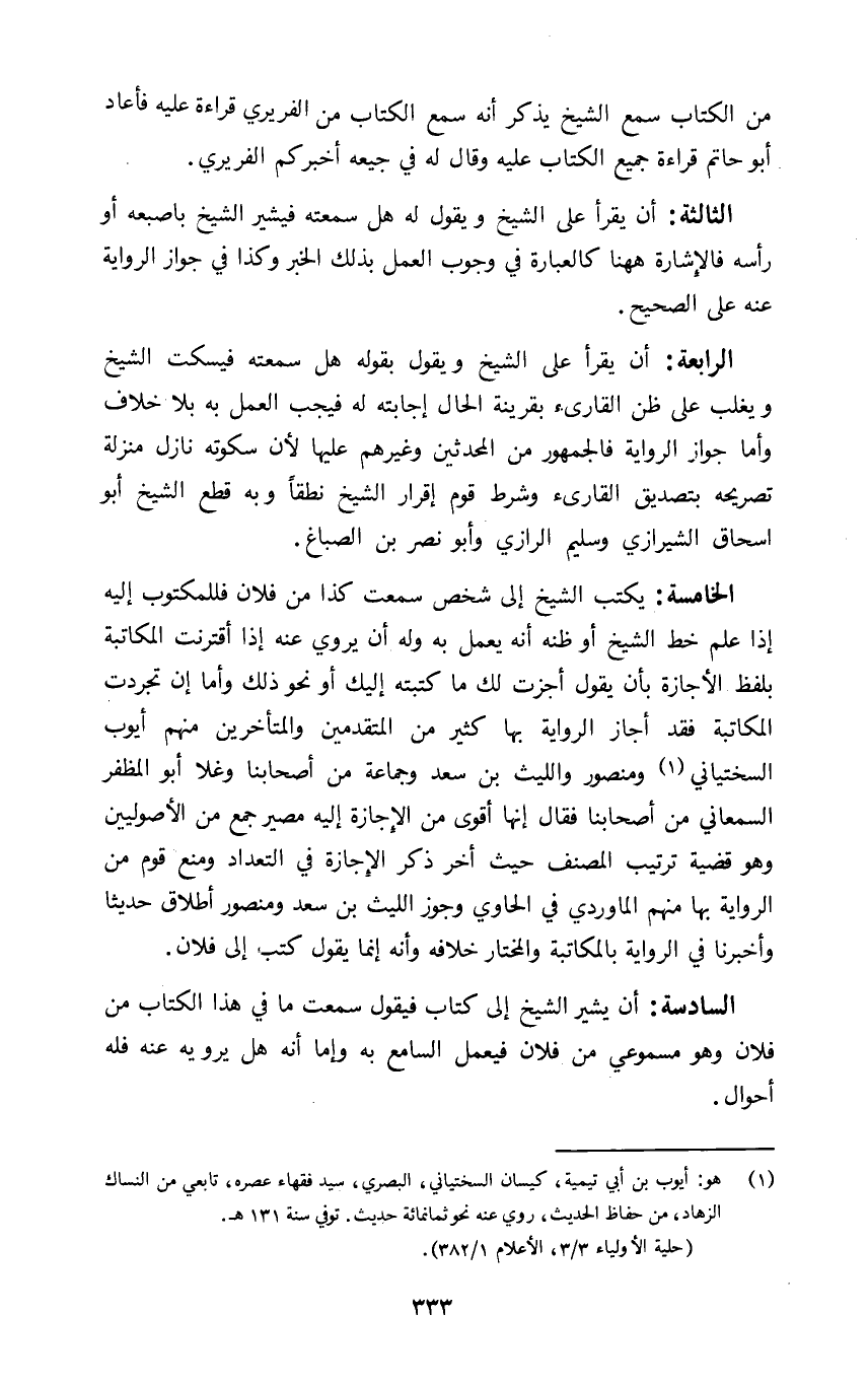 السادسة: أن يشير الشيخ إلى كتاب فيقول سمعت ما في هذا الكتاب من فلان وهو مسموعي من فلان فيعمل السامع به وإما أنه هل يرويه عنه فله أحوال.