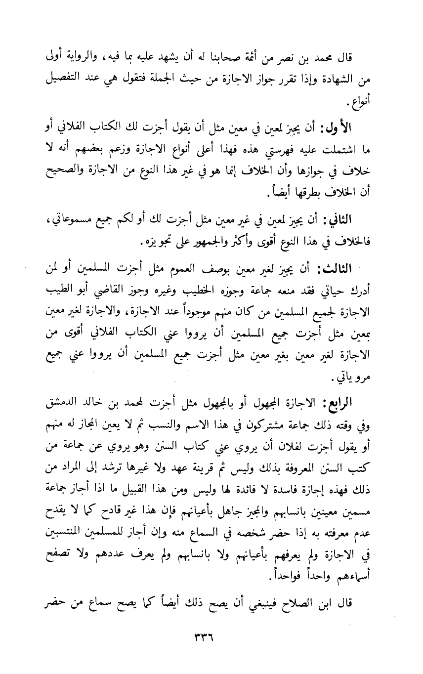 الثالث: أن يجيز لغير معين بوصف العموم مثل أجزت المسلمين أو لمن أدرك حياتي فقد منعه جماعة وجوزه الخطيب وغيره وجوز القاضي أبو الطيب الاجازة لجميع المسلمين من كان منهم موجودا عند الاجازة والاجازة لغير معين بمعين مثل أجزت جميع المسلمين أن يرووا عنى الكتاب الفلاني أقوى من الاجازة لغير معين بغير معين مثل أجزت جميع المسلمين أن يرووا عنى جميع مروياتي.