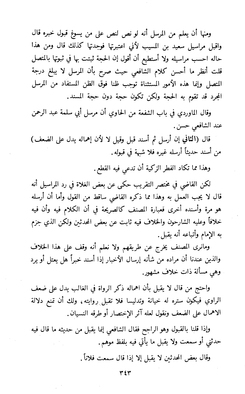 ومنها أن يعلم من المرسل أنه لو نص لنص على من يسوغ قبول خبره قال واقبل مراسيل سعيد بن السيب لأني اعتبرتها فوجدتها كذلك قال ومن هذا حاله احسب مراسيله ولا أستطيع أن أقول إن الحجة ثبتت بها في ثبوتها بالمتصل قلت أنظر ما أحسن كلام الشافعي حيث صرح بأن المرسل لا يبلغ درجة المتصل وإنما هذه الأمور المستثناة توجب ظنا فوق الظن المستفاد من المرسل المجرد قد تقوم به الحجة ولكن تكون حجة دون حجة المسند.
