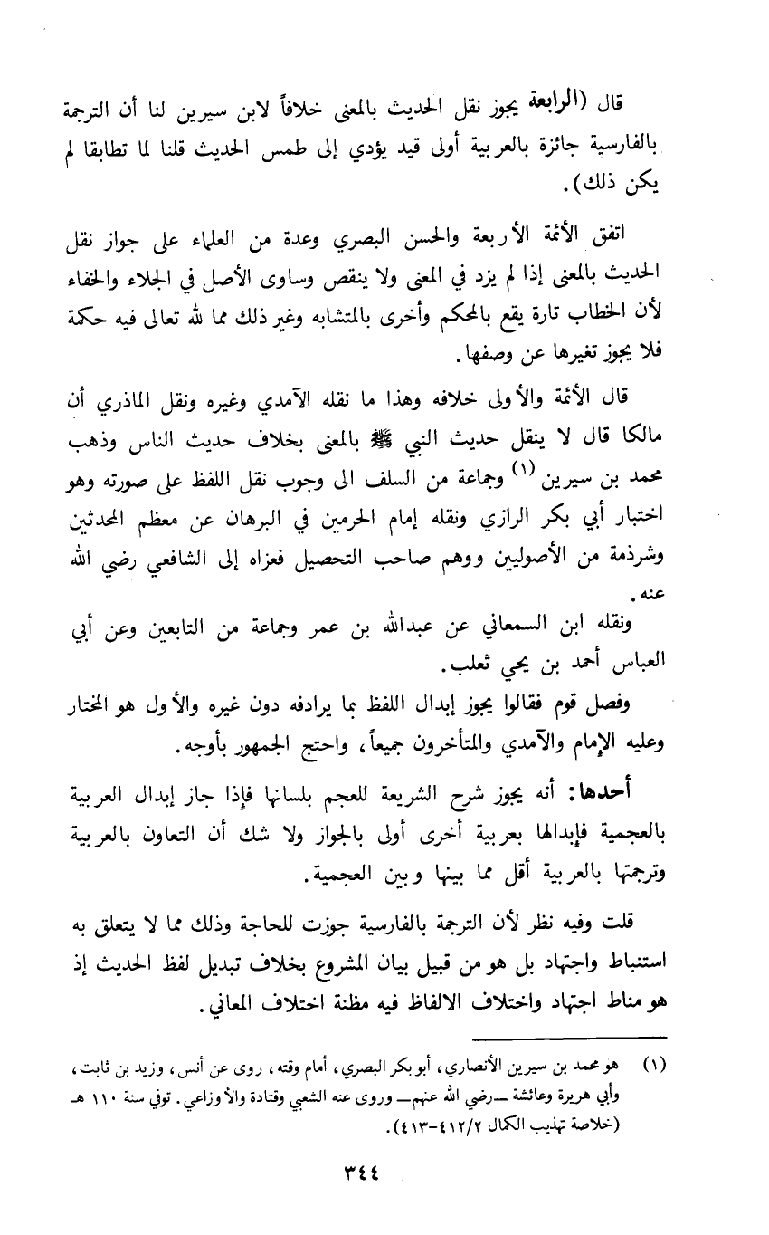 قال الرابعة يجوز نقل الحديث بالمعنى خلافا لابن سيرين لنا أن الترجمة بالفارسية جائزة بالعربية أولى قيد يؤدي إلى طمس الحديث قلنا لما تطابقا لم يكن ذلك.