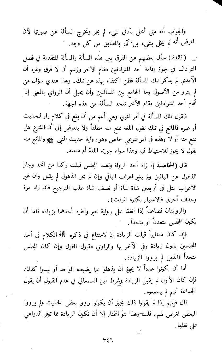 فائدة: سأل بعضهم عن الفرق بين هذه المسألة والمسألة المتقدمة في فصل الترادف في جوازه إقامة أحد المترادفين مقام الآخر وزعم أن لا فرق وغره أن الآمدي لم يذكر تلك المسألة فظن اكتفاء بهذه عن تلك وهذا عندي سؤال من لم يترو من الأصول وما الجامع بين المسألتين وأن يحيل أن الراوي بالمعنى إذا أقام أحد المترادفين مقام الآخر تتحد المسألة من هذه الجهة.