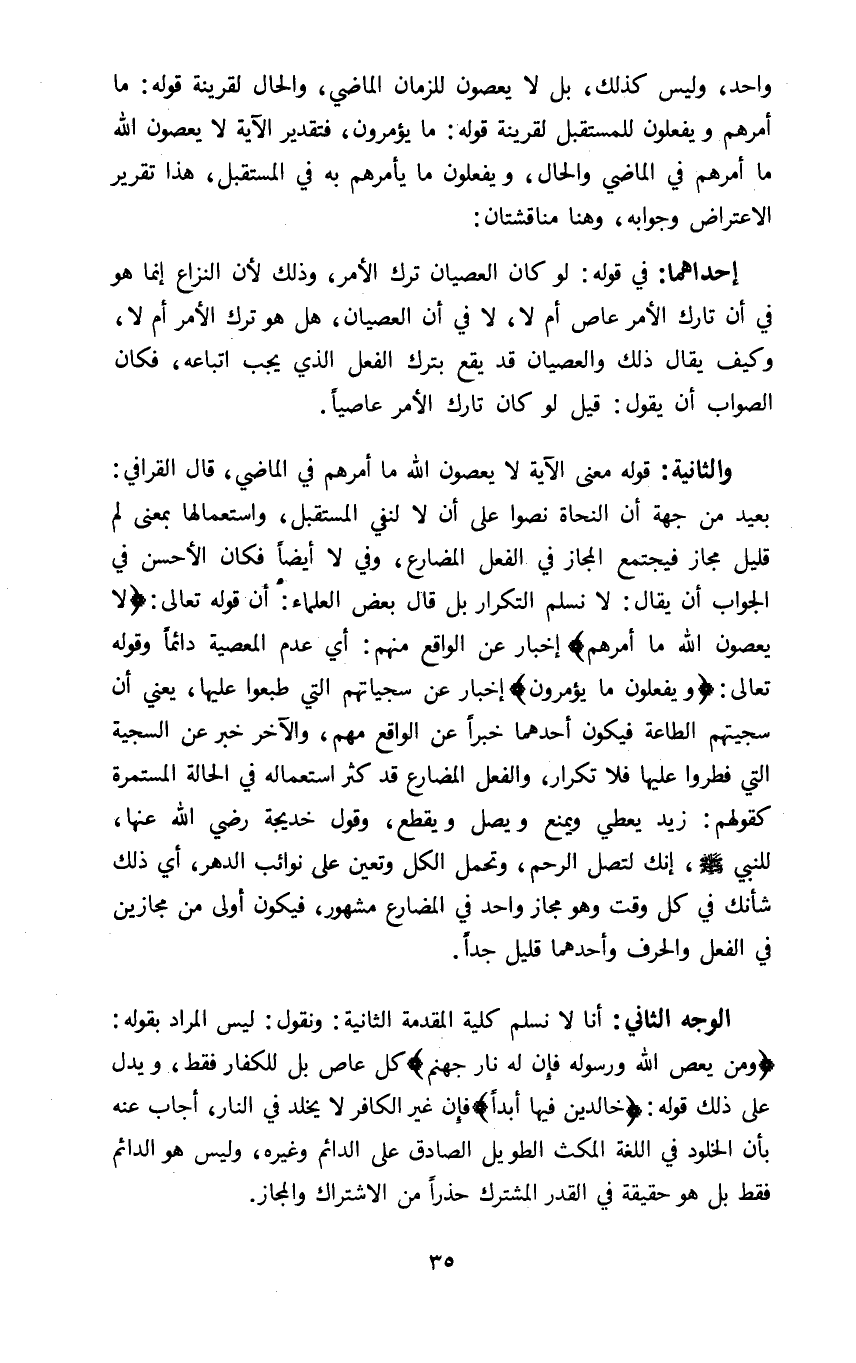 الوجه الثاني: انا لا نسلم كلية المقدمة الثانية ونقول ليس المراد بقوله: {وَمَنْ يَعْصِ اللَّهَ وَرَسُولَهُ فَإِنَّ لَهُ نَارَ جَهَنَّمَ} كل عاص بل للكفار فقط ويدل على ذلك قوله: {خَالِدِينَ فِيهَا أَبَداً} فان غير الكافر لا يخلد في النار أجاب عنه بأن الخلود في اللغة المكث الطويل الصادق على الدائم وغيره وليس هو الدائم فقط بل هو حقيقة في القدر المشترك حذرا من الاشتراك والمجاز.