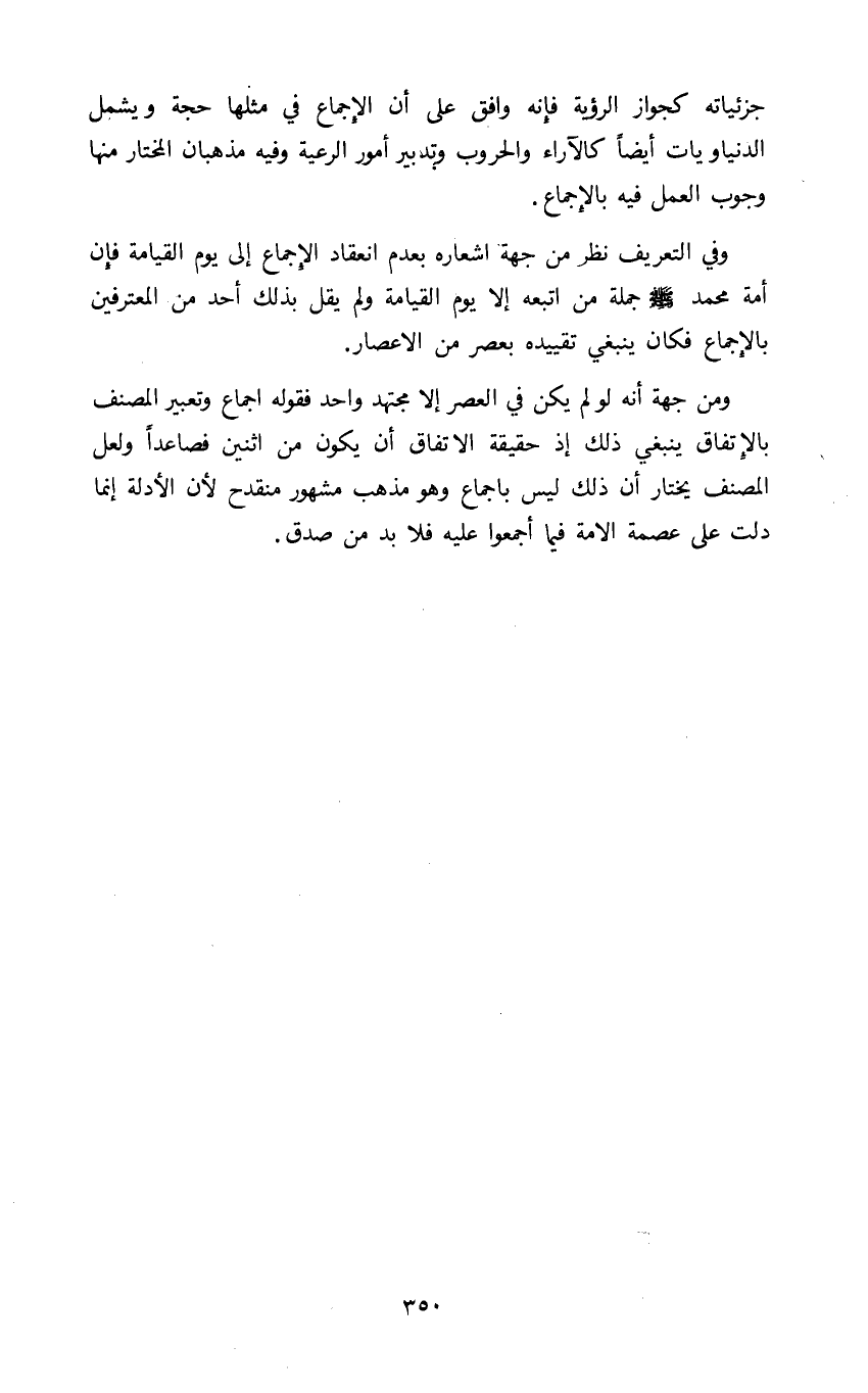 جزئياته كجواز الرؤية فإنه وافق على أن الإجماع في مثلها حجة ويشمل الدنياويات أيضا كالآراء والحروب وتدبير أمور الرعية وفيه مذهبان المختار منها وجوب العمل فيه بالإجماع.