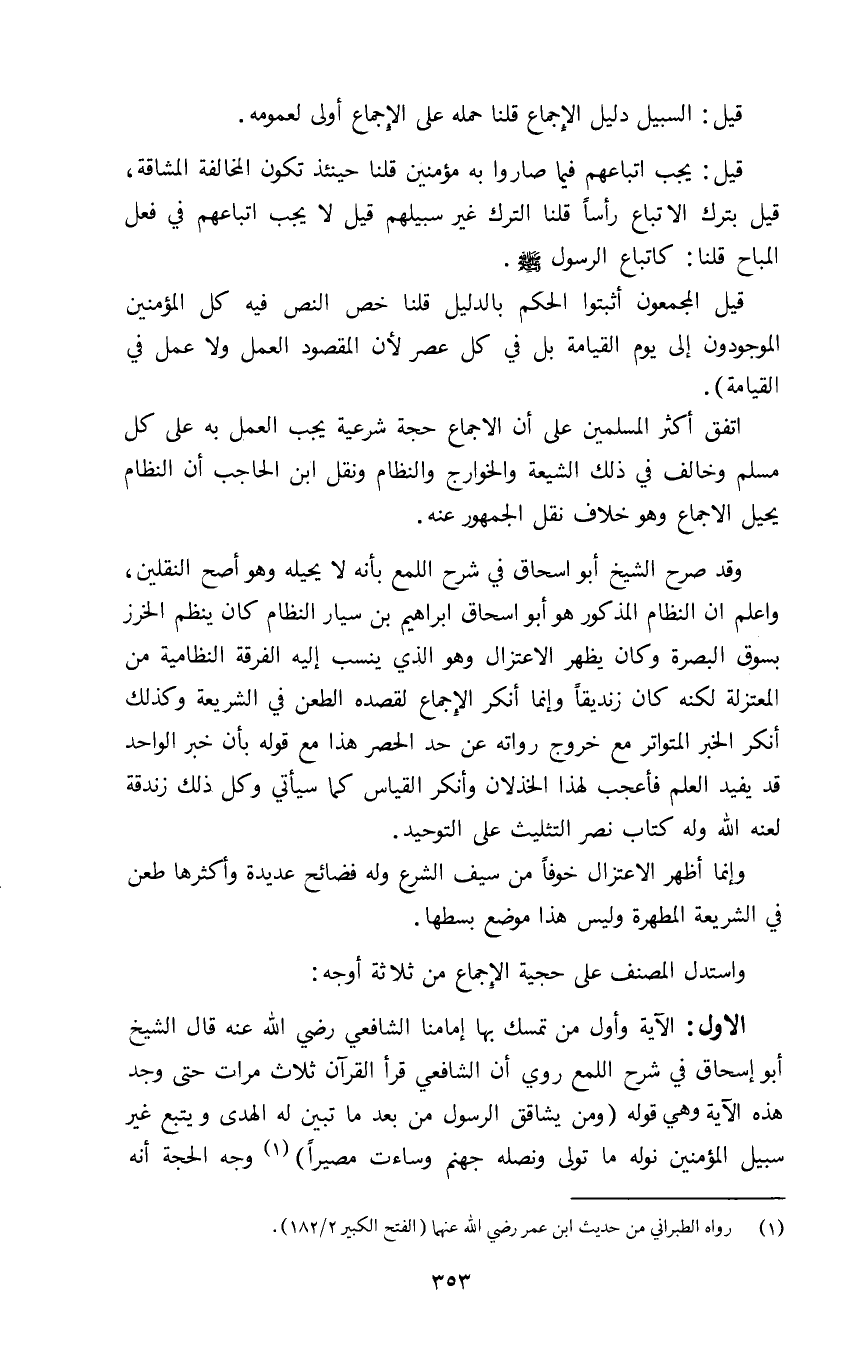 الأول: الآية وأول من تمسك بها إمامنا الشافعي رضي الله عنه قال الشيخ أبو إسحاق في شرح اللمع روي أن الشافعي قرا القرآن ثلاث مرات حتى وجد هذه الآية وهي قوله: {وَمَنْ يُشَاقِقِ الرَّسُولَ مِنْ بَعْدِ مَا تَبَيَّنَ لَهُ الْهُدَى وَيَتَّبِعْ غَيْرَ سَبِيلِ الْمُؤْمِنِينَ نُوَلِّهِ مَا تَوَلَّى وَنُصْلِهِ جَهَنَّمَ وَسَاءَتْ مَصِيراً} ١ وجه الحجة أنه