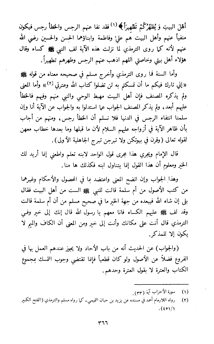 وأما السنة فما روى الترمذي وأخرج مسلم في صحيحه معناه من قوله صلى الله عليه وسلم: "إني تارك فيكم ما إن تمسكتم به لن تضلوا كتاب الله وعترتي" ٢ وأما المعنى ولم يذكره المصنف فإن أهل البيت مهبط الوحي والنبي منهم وفيهم فالخطأ عليهم أبعد ولم يذكر المصنف الجواب عما استدلوا به والجواب عن الآية أنا وإن سلمنا انتفاء الرجس في الدنيا فلا نسلم أن الخطأ رجس ومنهم من أجاب بأن ظاهر الآية في أزواجه عليهم السلام لأن ما قبلها وما بعدها خطاب معهن لقوله تعالى: {وَقَرْنَ فِي بُيُوتِكُنَّ وَلا تَبَرَّجْنَ تَبَرُّجَ الْجَاهِلِيَّةِ الْأُولَى} .