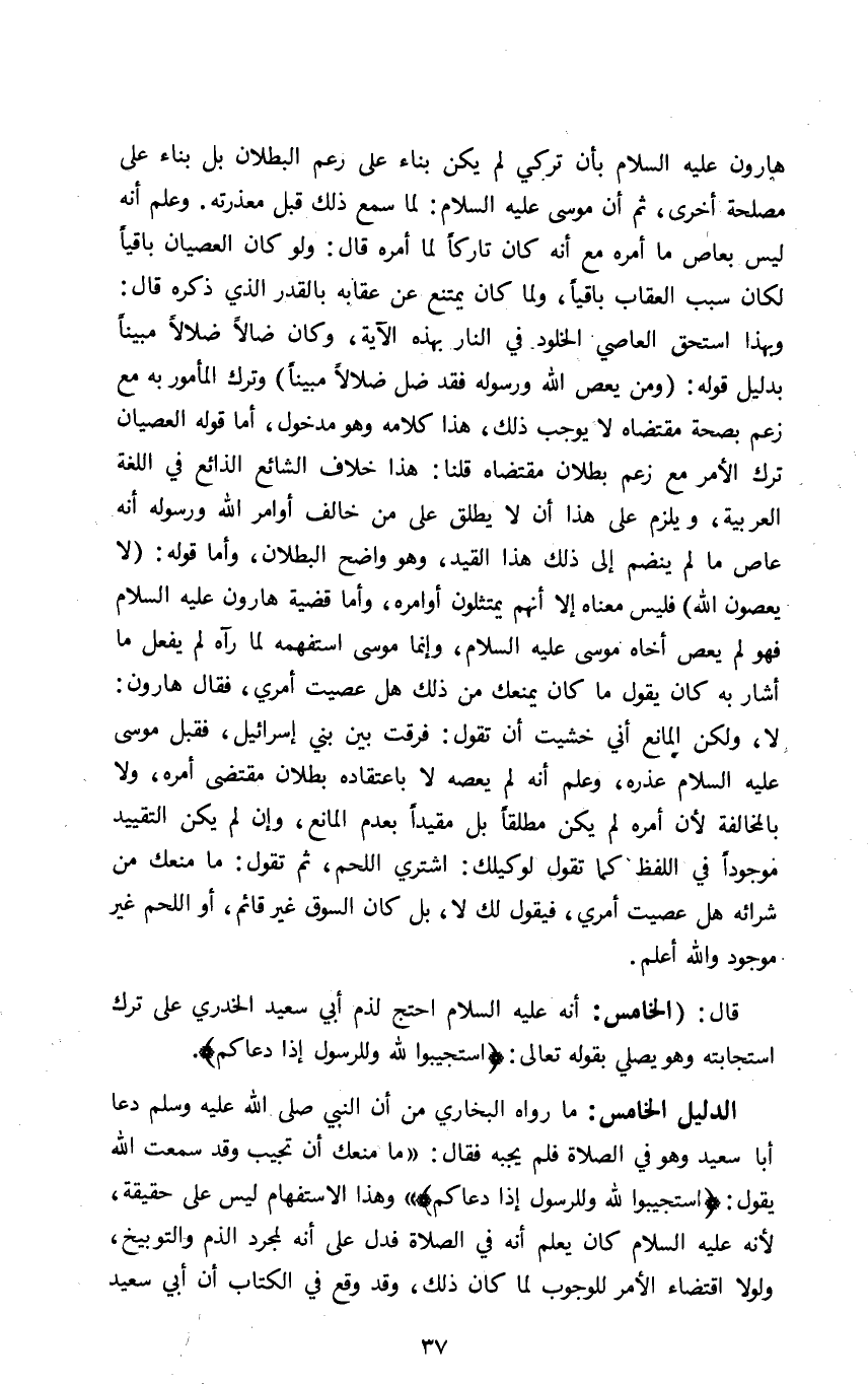 قال: الخامس: أنه عليه السلام احتج لذم أبي سعيد الخدري على ترك استجابته وهو يصلي بقوله تعالى: {اسْتَجِيبُوا لِلَّهِ وَلِلرَّسُولِ إِذَا دَعَاكُمْ} .