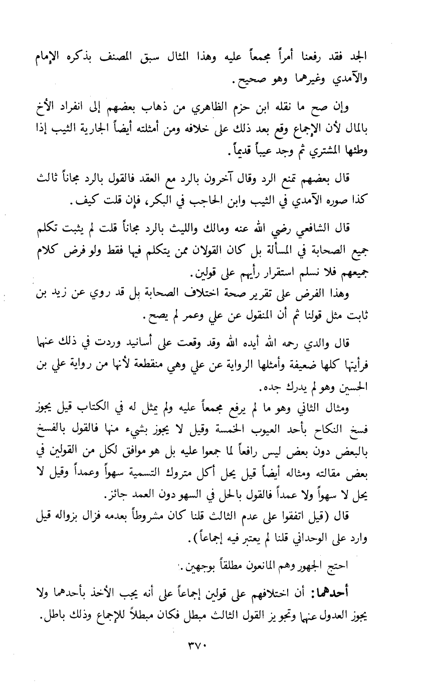 وإن صح ما نقله ابن حزم الظاهري من ذهاب بعضهم إلى انفراد الأخ بالمال لأن الإجماع وقع بعد ذلك على خلافة ومن أمثلته أيضا الجارية الثيب إذا وطئها المشتري ثم وجد عيبا قديما.