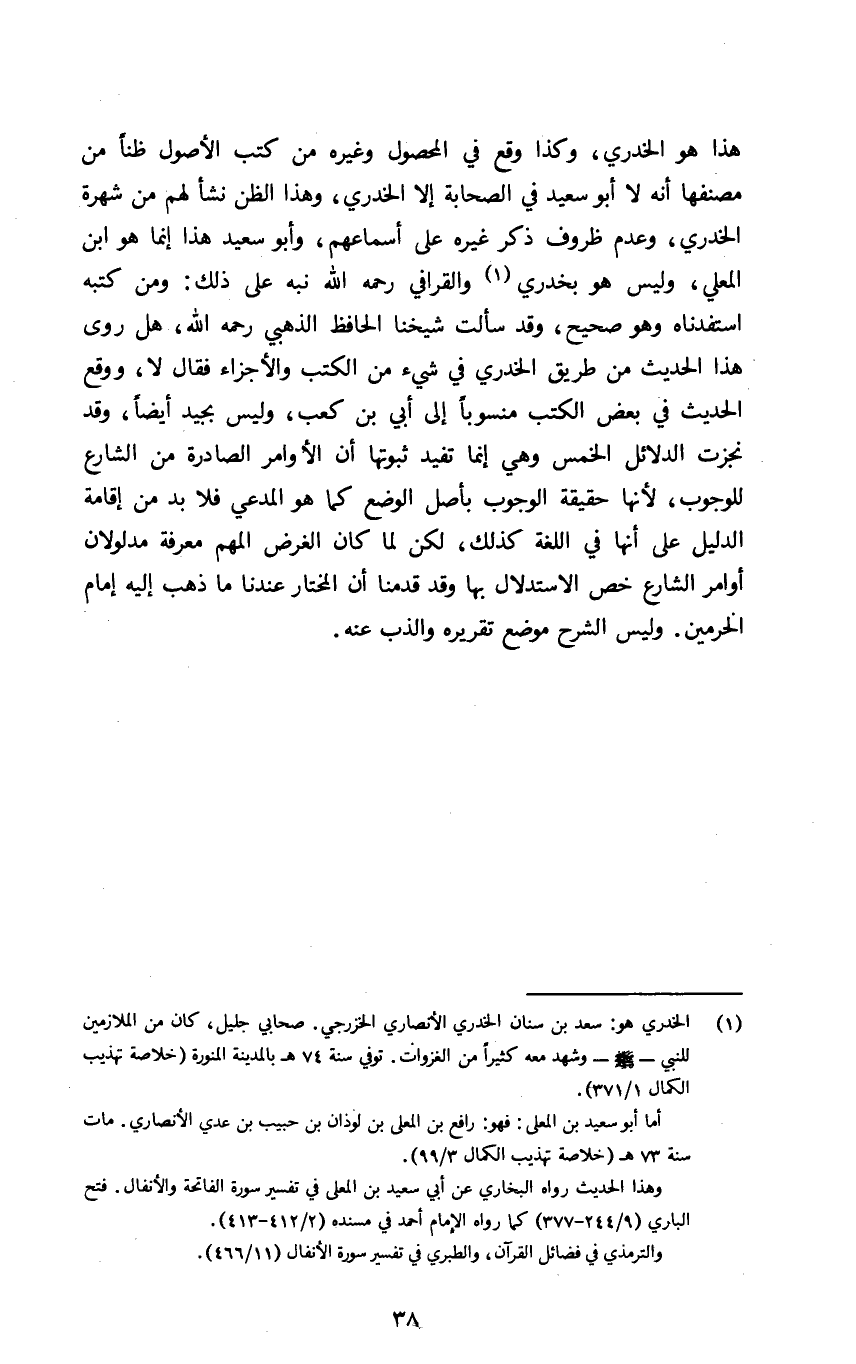 هذا هو الخدري وكذا وقع في المحصول وغيره من كتب الأصول ظنا من مصنفها أنه لا أبو سعيد في الصحابة إلا الخدري وهذا الظن نشأ لهم من شهرة الخدري وعدم ظروف ذكر غيره على أسماعهم وأبو سعيد هذا إنما هو أبن المعلي وليس هو بخدري١ والقرافي رحمه الله نبه على ذلك ومن كتبه إستفدناه وهو صحيح وقد سألت شيخنا الحافظ الذهبي رحمه الله هل روى هذا الحديث من طريق الخدري في شيء من الكتب والأجزاء فقال لا ووقع الحديث في بعض الكتب منسوبا إلى أبي بن كعب وليس بجيد ايضا وقد نجزت الدلائل الخمس وهي إنما تفيد ثبوتها أن الأوامر الصادرة من الشارع للوجوب لأنها حقيقة الوجوب بأصل الوضع كما هو المدعي فلا بد من إقامة الدليل على أنها في اللغة كذلك لكن لما كان الغرض المهم معرفة مدلولان أوامر الشارع خص الاستدلال بها وقد قدمنا أن المختار عندنا ما ذهب إليه امام الحرمين وليس الشرح موضع تقريره والذب عنه.