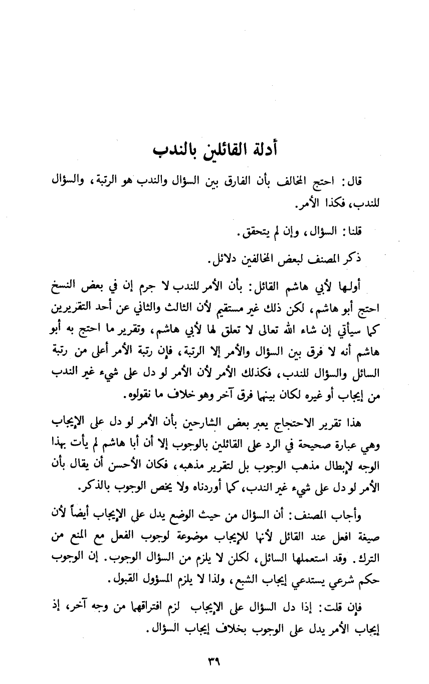 أولها لأبى هاشم القائل بأن الأمر للندب لا جرم إن في بعض النسخ احتج أبو هشام لكن ذلك غير مستقيم لان الثالث والثاني عن أحد التقريرين كما سيأتي ان شاء الله تعالى لا تعلق لها لأبي هاشم وتقرير ما احتج به أبو هاشم أنه لا فرق بين السؤال والأمر إلا الرتبة فإن رتبة الأمر أعلى من رتبة السائل والسؤال للندب فكذلك الأمر لأن الأمر لو دل على شيء غير الندب من إيجاب أو غيره لكان بينهما فرق آخر وهو خلاف ما نقوله.