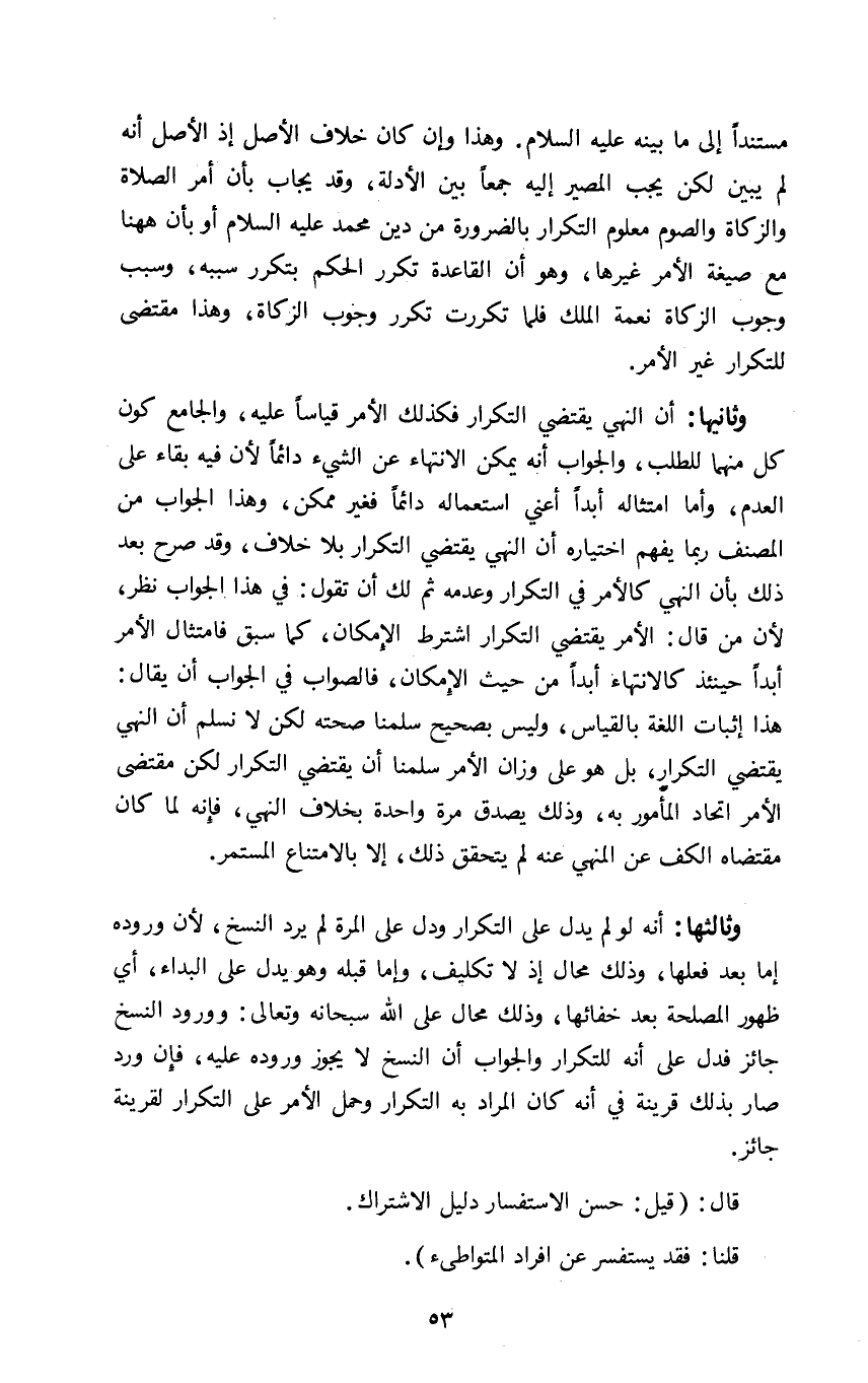 وثانيها: أن النهي يقتضى التكرار فكذلك الأمر قياسا عليه والجامع كون كل منهما للطلب والجواب أنه يمكن الانتهاء عن الشيء دائما لأن فيه بقاء على العدم وأما امتثاله أبدا اعني استعماله دائما فغير ممكن وهذا الجواب من المصنف ربما يفهم اختياره أن النهي يقتضي التكرار بلا خلاف وقد صرح بعد ذلك بأن النهي كالأمر في التكرار وعدمه ثم لك أن تقول في هذا الجواب نظر لأن من قال الأمر يقتضي التكرار اشترط الإمكان كما سبق فامتثال الأمر أبدا حينئذ كالانتهاء أبدا من حيث الإمكان فالصواب في الجواب أن يقال هذا إثبات اللغة بالقياس وليس بصحيح سلمنا صحته لكن لا نسلم أن النهي يقتضي التكرار بل هو على وزان الأمر سلمنا أن يقتضي التكرار لكن مقتضى الأمر اتحاد المأمور به وذلك يصدق مرة واحدة بخلاف النهي فإنه لما كان مقتضاه الكف عن المنهي عنه لم يتحقق ذلك إلا بالإمتناع المستمر.