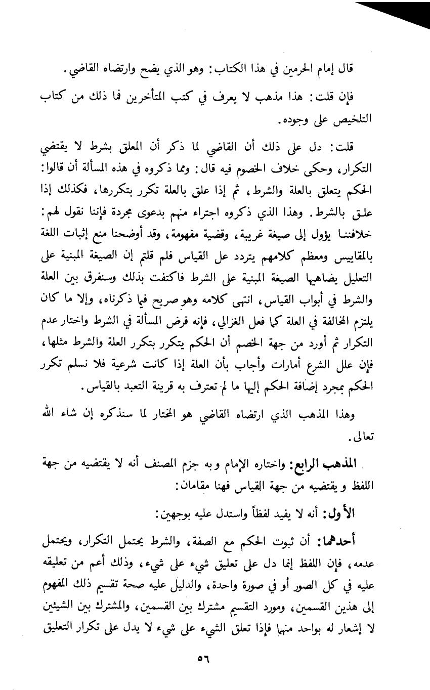 أحدهما: أن ثبوت الحكم مع الصفة والشرط يحتمل التكرار ويحتمل عدمه فان اللفظ إنما دل على تعليق شيء على شيء وذلك اعم من تعليقه عليه في كل الصور أو في صورة واحدة والدليل عليه صحة تقسيم ذلك المفهوم إلى هذين القسمين وموود التقسيم مشترك بين القسمين والمشترك بين الشيئين لا إشعار له بواحد منهما فإذا تعلق الشيء على شيء لا يدل على تكرار التعليق
