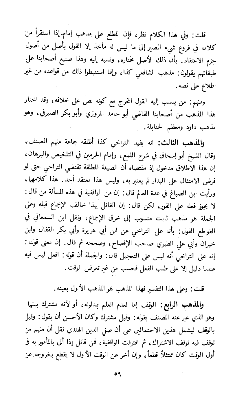 والمذهب الثالث: انه يفيد التراخي كذا أطلقه جماعة منهم المصنف وقال الشيخ أبو اسحاق في شرح اللمع وإمام الحرمين في التلخيص والبرهان ان هذا الاطلاق مدخول إذ مقتضاه ان الصيغة المطلقة تقتضي التراخي حتى لو فرض الامتثال على البدار لم يعتبر به وليس هذا معتقد أحد هذا كلامهما ورأيت ابن الصباغ في عدة العالم قال أن من الواقفية في هذه المسالة من قال لا يجوز فعله على الفور لكن قال إن القائل بهذا خالف الاجماع قبله وعلى الجملة هو مذهب ثابت منسوب إلى خرق الإجماع ونقل ابن السمعاني في القواطع القول بأنه على التراخي عن ابن أبي هريرة وأبي بكر القفال وابن خيران وأبي على الطبري صاحب الإفصاح وصححه ثم قال إن معنى قولنا أنه على التراخي أنه ليس على التعجيل قال والجملة أن قوله افعل ليس فيه عندنا دليل إلا على طلب الفعل فحسب من غير تعرض الوقت.