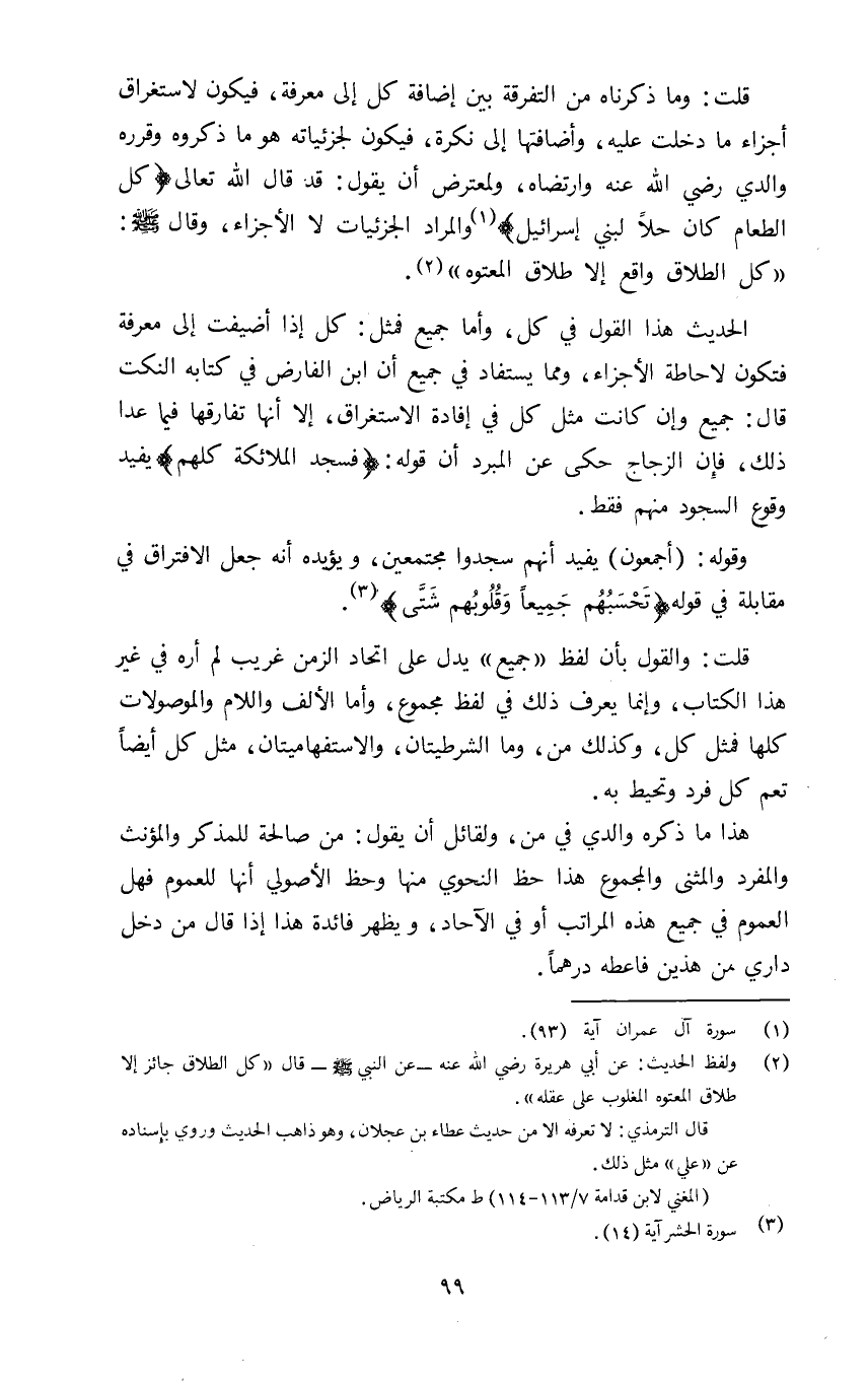 قلت: وما ذكرناه من التفرقة بين إضافة كل إلى معرفة فيكون لاستغراق أجزاء ما دخلت عليه أضافتها إلى نكرة فيكون لجزيئاته هو ما ذكروه وقرره والدي رضي الله عنه وارتضاه ولمعترض ان يقول: قال الله تعالى: {كُلُّ الطَّعَامِ كَانَ حِلاًّ لِبَنِي إِسْرائيلَ} ١ والمراد الجزئيات لا الأجزاء وقال صلى الله عليه وسلم: "كل الطلاق واقع الا طلاق المعتوه" ٢.