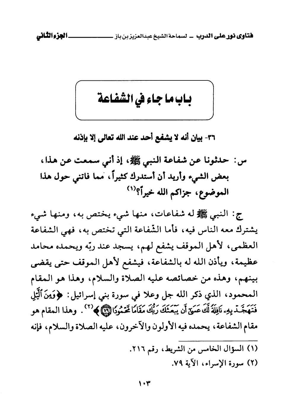 ج: النبي - صلى الله عليه وسلم - له شفاعات، منها شيء يختص به، ومنها شيء يشترك معه الناس فيه، فأما الشفاعة التي تختص به، فهي الشفاعة العظمى لأهل الموقف يشفع لهم، يسجد عند ربه ويحمده محامد عظيمة، ويأذن الله له بالشفاعة، فيشفع لأهل الموقف حتى يقضى بينهم، وهذه من خصائصه عليه الصلاة والسلام، وهذا هو المقام المحمود، الذي ذكر الله جل وعلا في سورة بني إسرائيل: {وَمِنَ اللَّيْلِ فَتَهَجَّدْ بِهِ نَافِلَةً لَكَ عَسَى أَنْ يَبْعَثَكَ رَبُّكَ مَقَامًا مَحْمُودًا} (¬2) وهذا المقام هو مقام الشفاعة، يحمده فيه الأولون والآخرون، عليه الصلاة والسلام، فإنه