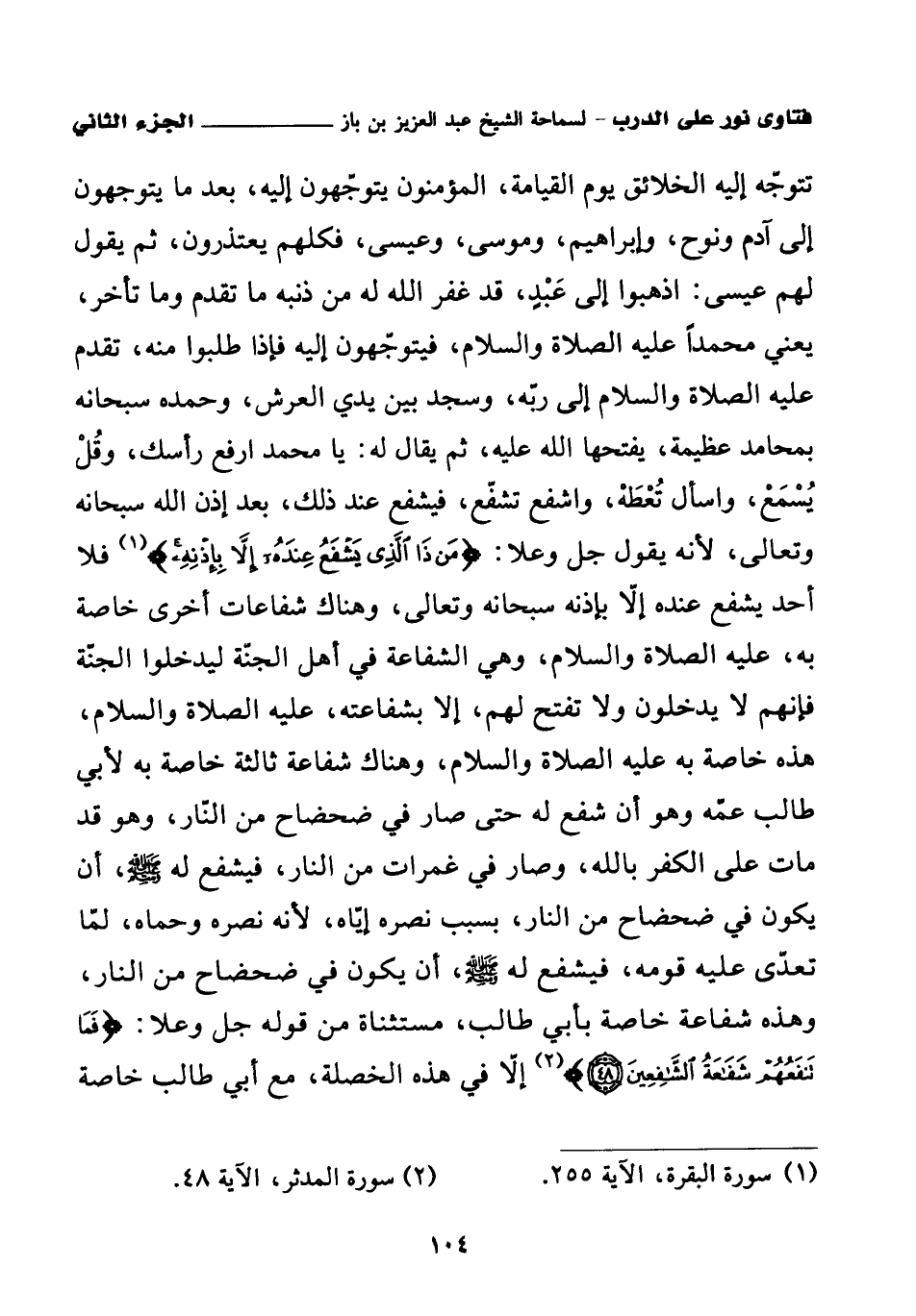 وهناك شفاعات أخرى خاصة به، عليه الصلاة والسلام، وهي الشفاعة في أهل الجنة ليدخلوا الجنة فإنهم لا يدخلون ولا تفتح لهم إلا بشفاعته، عليه الصلاة والسلام، هذه خاصة به عليه الصلاة والسلام، وهناك شفاعة ثالثة خاصة به لأبي طالب عمه وهو أن شفع له حتى صار في ضحضاح من النار، وهو قد مات على الكفر بالله، وصار في غمرات من النار، فيشفع له - صلى الله عليه وسلم - أن يكون في ضحضاح من النار، بسبب نصره إياه، لأنه نصره وحماه لما تعدى عليه قومه، فيشفع له - صلى الله عليه وسلم - أن يكون في ضحضاح من النار، وهذه شفاعة خاصة بأبي طالب، مستثناة من قوله جل وعلا: {فَمَا تَنْفَعُهُمْ شَفَاعَةُ الشَّافِعِينَ} (¬2) إلا في هذه الخصلة، مع أبي طالب خاصة