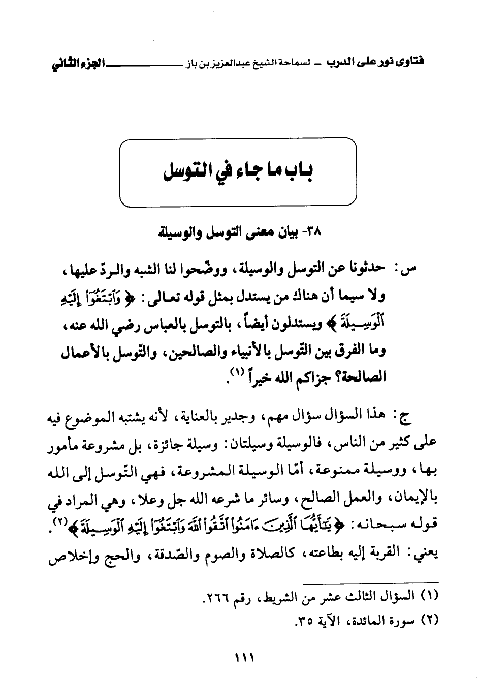 ج: هذا السؤال سؤال مهم، وجدير بالعناية، لأنه يشتبه الموضوع فيه على كثير من الناس، فالوسيلة وسيلتان: وسيلة جائزة، بل مشروعة مأمور بها، ووسيلة ممنوعة، أما الوسيلة المشروعة، فهي التوسل إلى الله بالإيمان، والعمل الصالح، وسائر ما شرعه الله جل وعلا، وهي المراد في قوله سبحانه: {يَا أَيُّهَا الَّذِينَ آمَنُوا اتَّقُوا اللَّهَ وَابْتَغُوا إِلَيْهِ الْوَسِيلَةَ} (¬3) يعني: القربة إليه بطاعته، كالصلاة والصوم والصدقة، والحج، وإخلاص